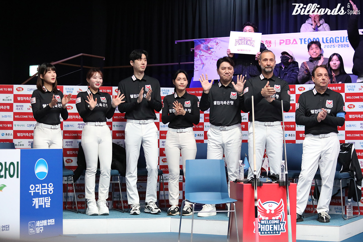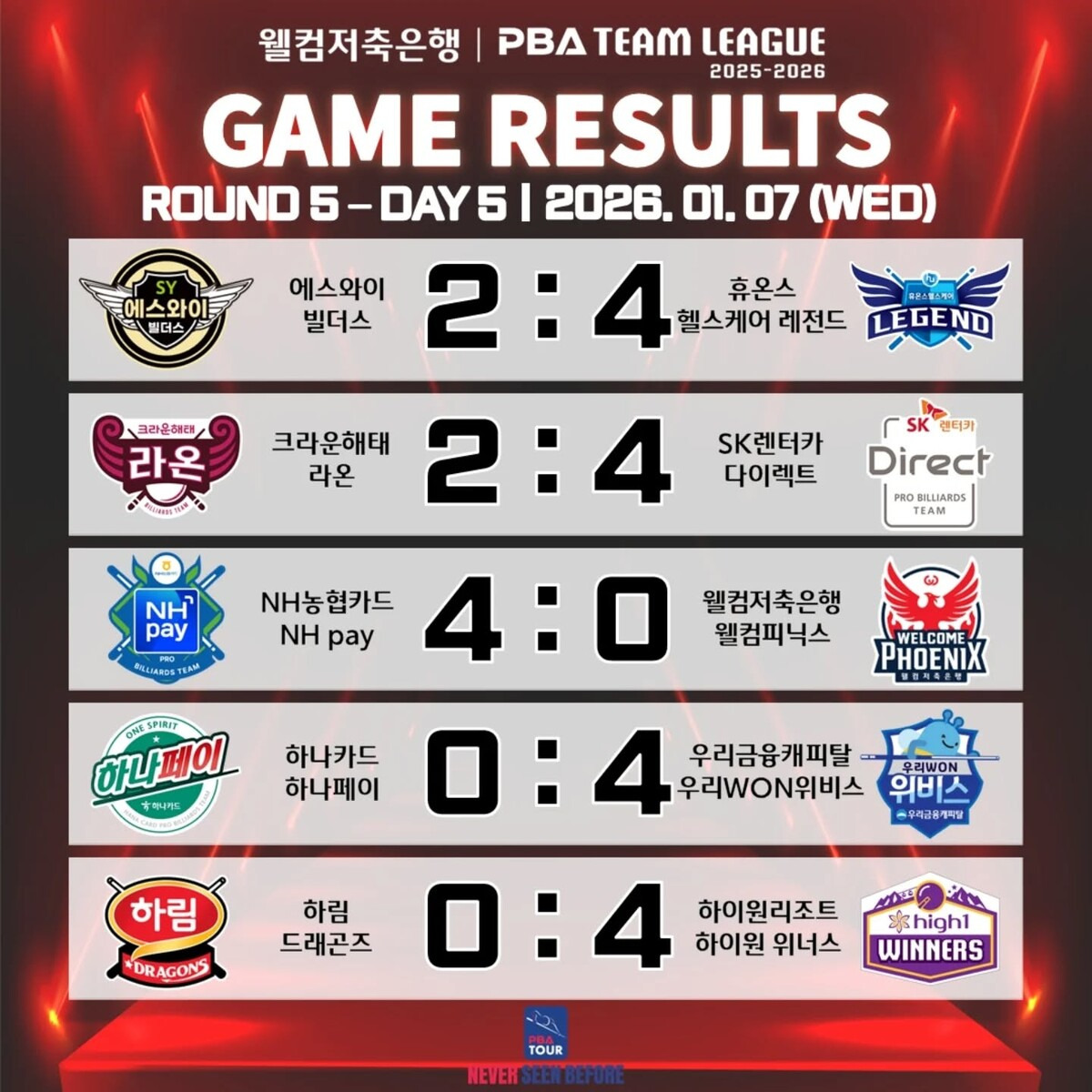 7일 오후 12시 30분에 경기도 고양시의 '고양 킨텍스 PBA 스타디움'에서 열린 '웰컴저축은행 PBA 팀리그 2025-2026' 5라운드 5일 차 경기에서 휴온스는 에스와이를 세트스코어 4-2로 꺾고 정규리그 꼴찌 탈출의 시동을 걸었다.