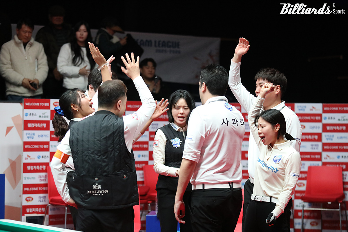 이어 3세트는 사파타가 9이닝 만에 15:2로 초클루를 꺾어 3-0으로 리드한 우리금융캐피탈은 4세트를 선지훈-김민영이 김병호-김진아에게 6이닝 만에 9:3으로 승리를 거두며 영봉승으로 승부를 마무리했다.