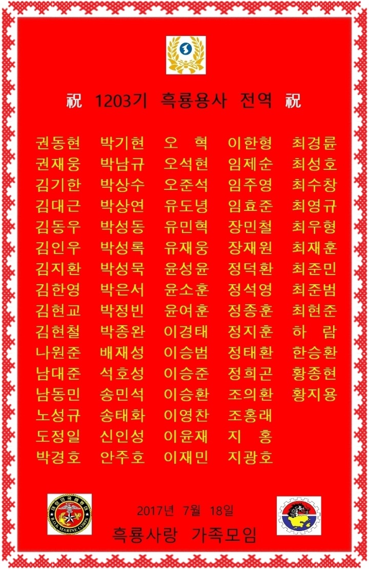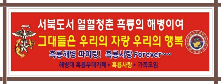 1203기 흑룡가족님~ 영광스런 전역을 앞둔 1203기 흑룡용사들의 전역을 축하하는 축하메세지에 사용하려고 자랑스런 해병이 사진을 요청합니다.