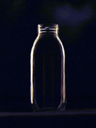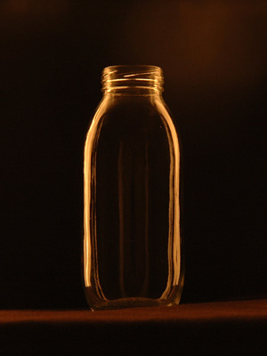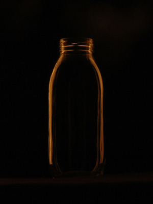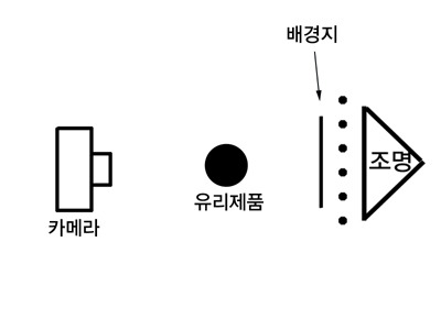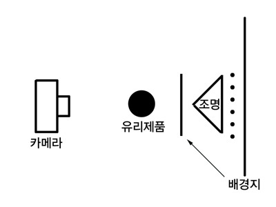 이때 주의할 점은 브라이트 필드 라이트와 마찬가지로 피사체 정면이나 측면(카메라의 시점)에서 어떠한 빛도 들어오지 않아야 합니다. 즉, 배경 조명 외에 다른 조명은 모두 끄고 촬영해야 합니다. 불필요한 빛이 반사되면 유리제품의 윤곽을 흐리게 할 수도 있고, 정면에 있는 여러 가지 물체들이 유리 표면에 비칠 수도 있기 때문입니다. 위 사진은 형광등을 켜고 촬영하여 유리병 표면에 다른 빛이 반사된 모습을 볼 수 있습니다.