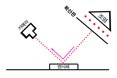 조명과 확산판(또는 소프트박스)을 금속을 통해 반사된 빛이 카메라의 위치에서 보이지 않도록 하는 것이 중요합니다. 이 때 금속을 통해 비춰진 빛이 카메라에 들어오지 않게 하려면 위의 그림과 같이 조명과 카메라를 설치하는 것이 좋습니다. 카메라의 위치를 반사체의 수직(정면)에 놓고 좌우 45˚ 방향에서 조명을 줍니다.