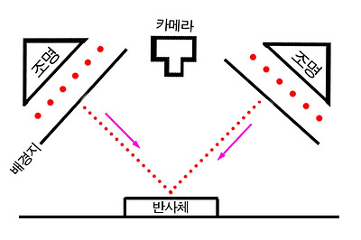 위와 같이 반사체인 금속을 빛나게 하려면 다음과 같은 조명방법이 필요합니다.