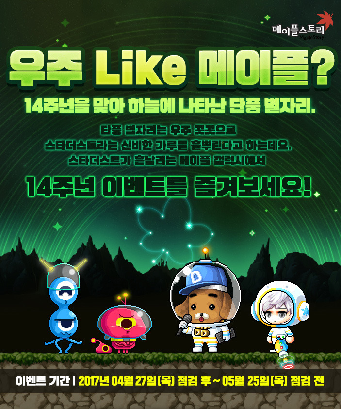 [이벤트]우주 Like 메이플? 작성자란바|작성시간17.04.27|조회수783 목록 댓글 0 글자크기 작게가 글자크기 크게가 다음검색 현재 게시글 추가 기능 열기 북마크 신고 센터로 신고 댓글 댓글 0 댓글쓰기 답글쓰기 댓글 리스트