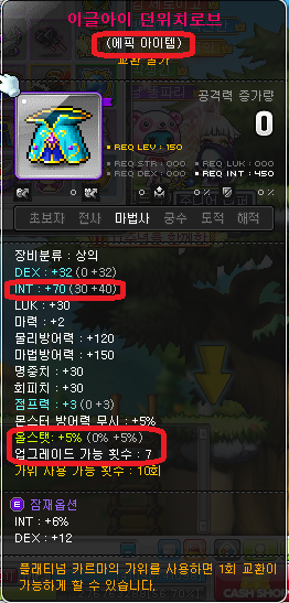 에픽 잠재가 인트6% 붙었습니다.(사실 이부분은 에픽인템이 레어/일반템보다 1억비싸기 때문에 보는거지 안봐도됨)