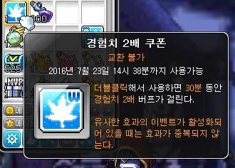 ex) 몬파 일요일 쿠폰, 2배 쿠폰, 1.5배 쿠폰, 다람쥐 쿠폰, 경험치 2배 이벤트도 포함