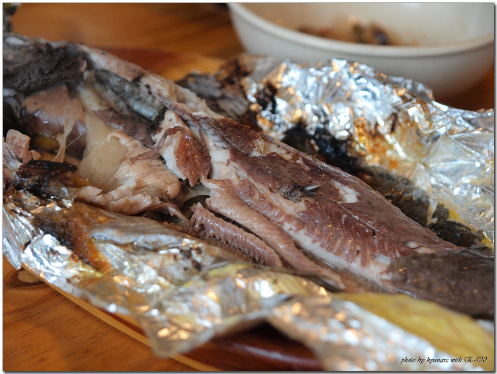 한마리씩 호일에 충분히 구워져나오고, 기름기 빠진 메기살만 골라 먹었다.
