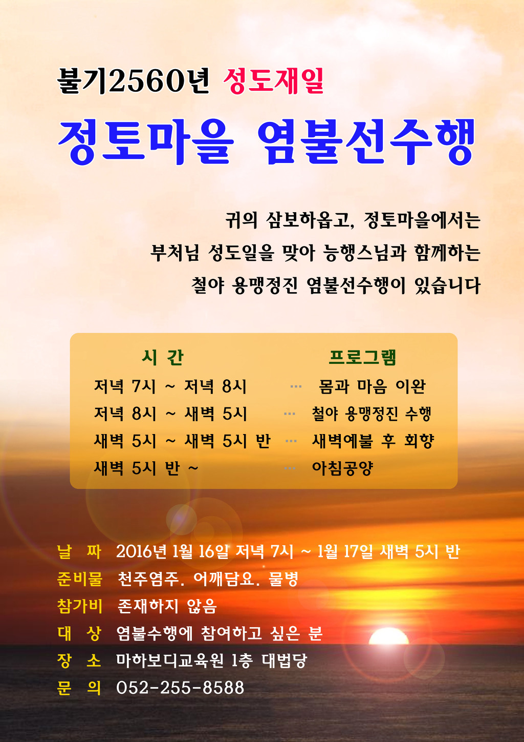 2016년 1월 염불선수행 안내 작성자더불어숲(자안)|작성시간16.01.14|조회수108 목록 댓글 0 글자크기 작게가 글자크기 크게가 다음검색 현재 게시글 추가 기능 열기 북마크 공유하기 신고 센터로 신고 댓글 댓글 0 댓글쓰기 답글쓰기 댓글 리스트