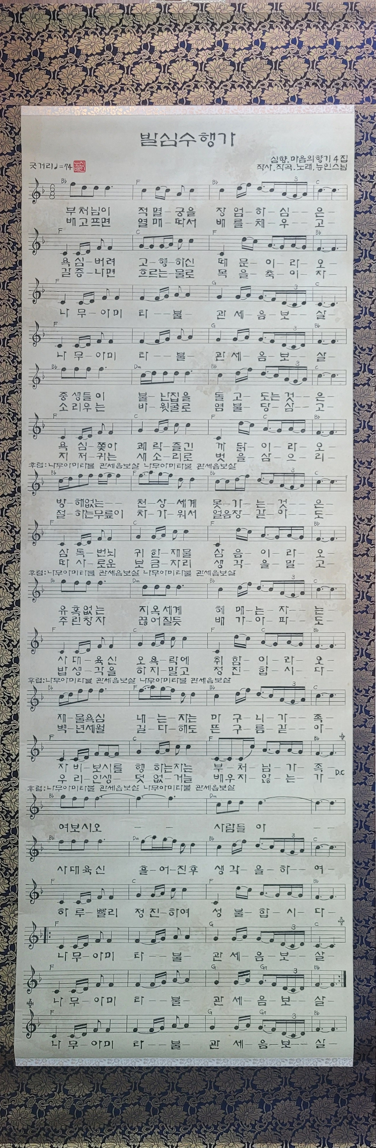 출시한 후 후대에 남기기 위해 소장이 용이하도록 가로70cm 세로200cm한지에다 소승이 먹으로 그려 족자로 만든 악보입니다.