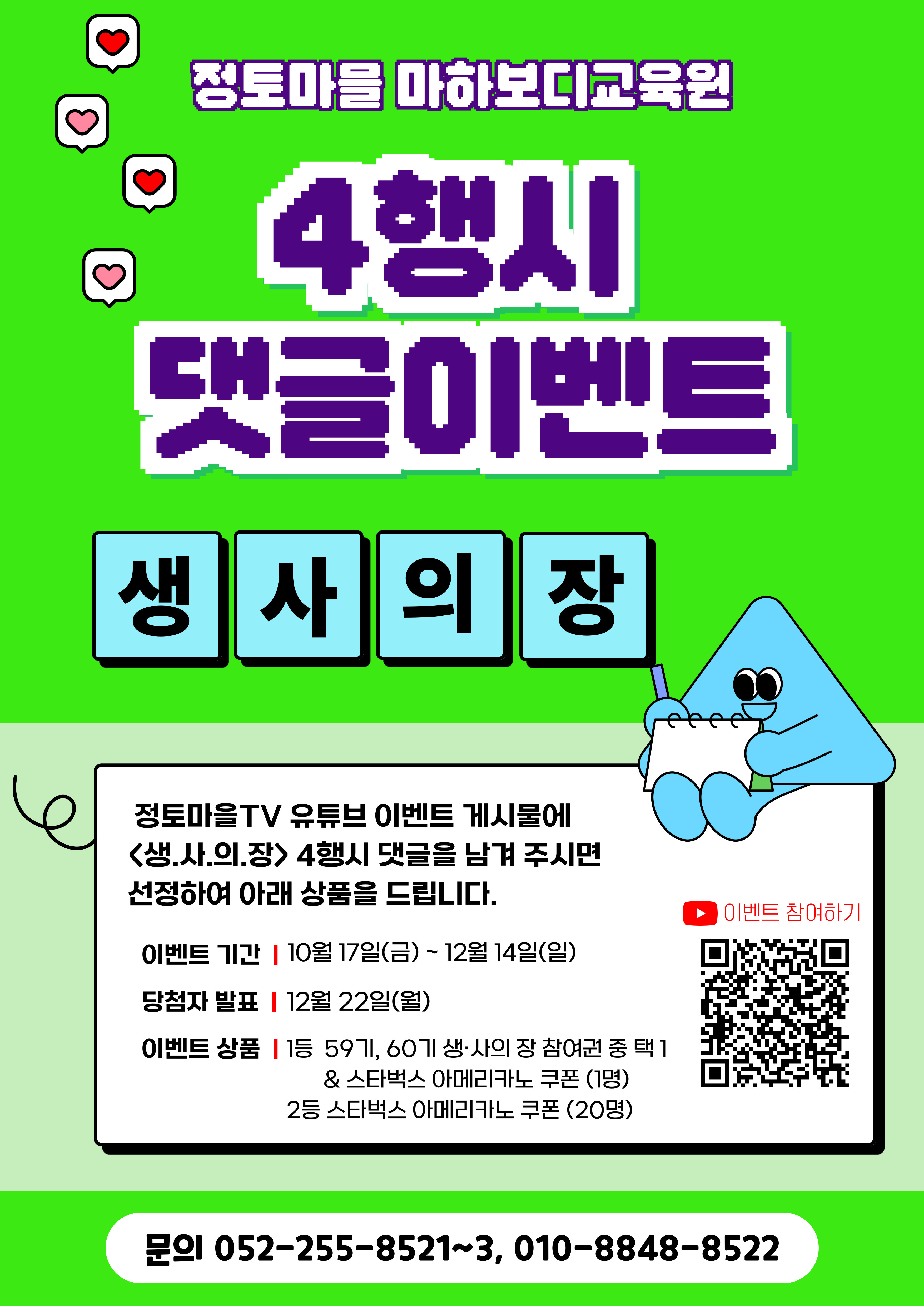 1. 정토마을TV 유튜브 이벤트 게시물에 "생.사.의.장" 4행시를 댓글로 남겨주세요.