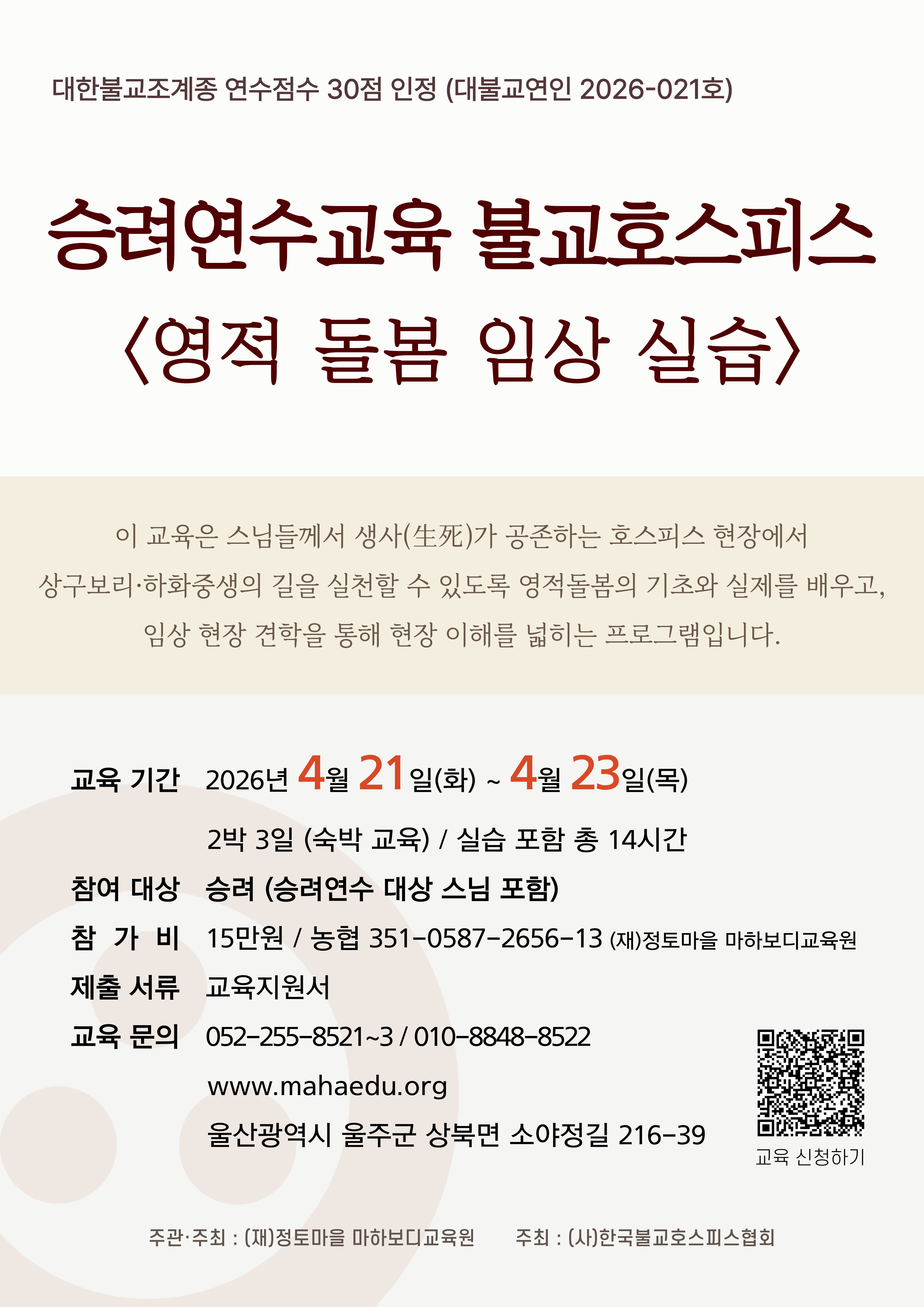 ※ 대한불교조계종 연수점수 30점 인정 (대불교연인 2026-021호)