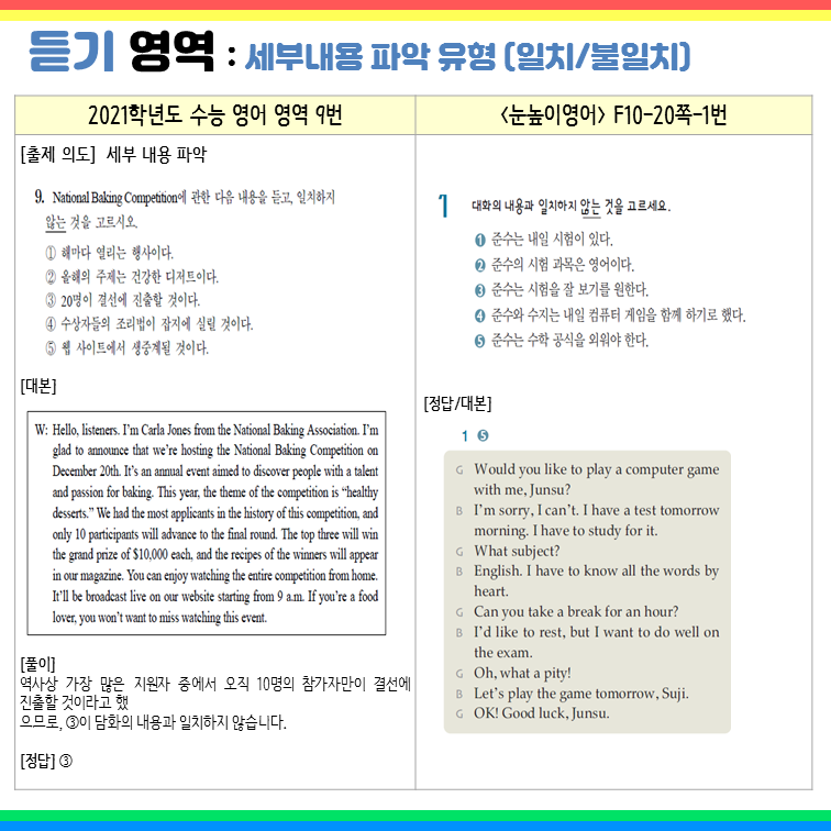 ‘세부 내용 파악’ 유형은 <눈높이영어>와 <i Listening>에서 많이 다루는 문제 유형입니다.