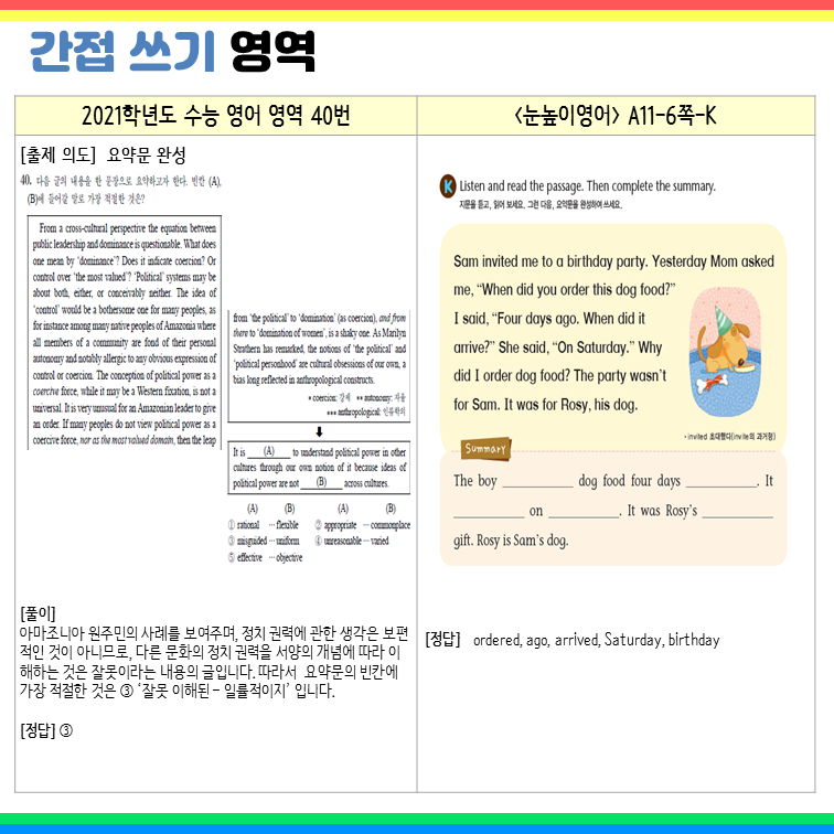 변별력을 가르는 주요 유형인 빈칸 추론 유형이나 간접 쓰기 유형은