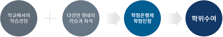 학점은행제는 「학점인정 등에 관한 법률」에 의거하여 학교에서 뿐만 아니라 학교 밖에서 이루어지는 다양한 형태의 학습 및 자격을 학점으로 인정받을 수 있도록 하고, 학점이 누적되어 일정 기준을 충족하면 학위취득을 가능하게 함으로써 궁극적으로 열린 학습사회, 평생학습사회를 구현하기 위한 제도입니다. 또한 학점은행제는 평생학습체제 실현을 위한 제도적 기반으로서 학교교육은 물론 다종다양한 평생교육의 학습결과를 사회적으로 공정하게 평가인정하고, 그 교육의 결과를 학교교육과 평생교육 간에 상호 인정하며, 이들이 상호 유기적으로 연계를 맺도록 함으로써 개개인의 학습력을 극대화할 수 있도록 하는 제도입니다