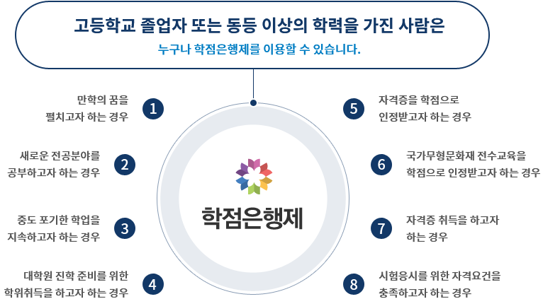 학점은행제는 국가평생교육제도로 이용 자격을 갖춘 사람들이라면 누구나 활용할 수 있는