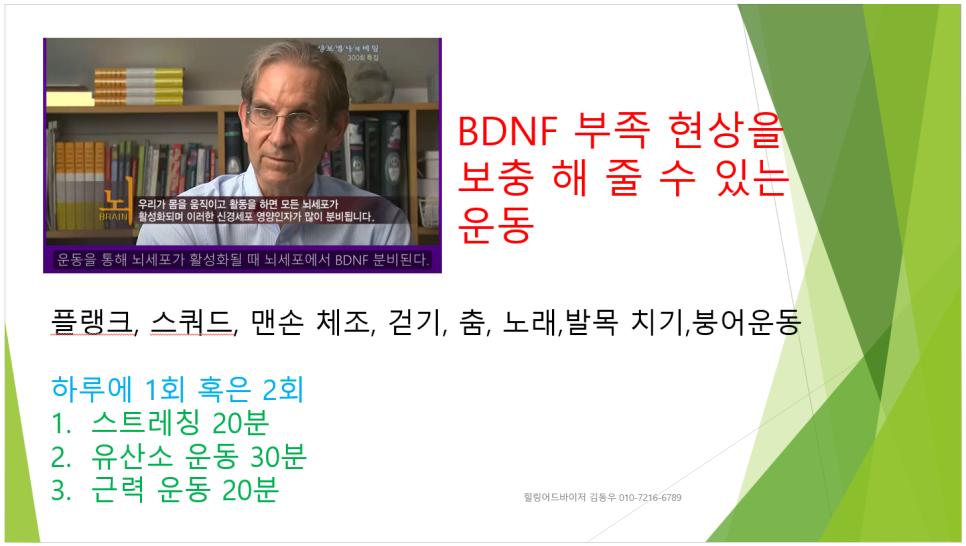 BSNF 부족 현상을 보충해 줄 수 있는 유일한 방법은 운동이다, 1주일에 다섯 번 정도는 하루에 1시간에서 1시간 30분 정도 운동을 하여야 한다, 가볍게 스트레칭을 20분 정도 하고 유산소 운동은 30분, 근력 운동은 20분 내외 정도 하여야 한다, 단, 무리하지 않는 범위 내에서 시도하여야 한다, 그리고 집안에서도 할 수 있는 운동으로는 플랭크, 스쿼드, 발목 치기, 붕어운동 등이다,