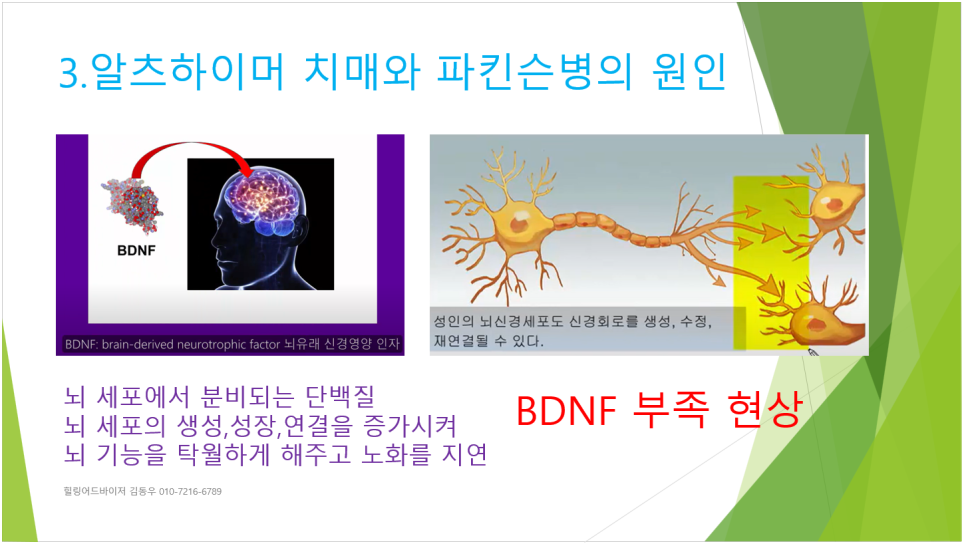 참고로 인체의 모든 부위에는 세포들이 존재하고 수많은 세포들은 전기적 신호를 상호 전달하여 정상적인 생명 유지를 위하여 활동을 한다, 예를 들어 심장에는 평균 1mV의 전기적 신호가 발생되고 뇌세포에서는 평균 50마이크로 볼트의 전기적 신호가 유지된다, 그런데 이러한 전기적 신호를 활성화시켜주는 역할을 하는 것이 BDNF이다, 이 BSNF가 부족하면 뇌 기능에 문제를 일으켜 비정상적인 현상이 일어난다,