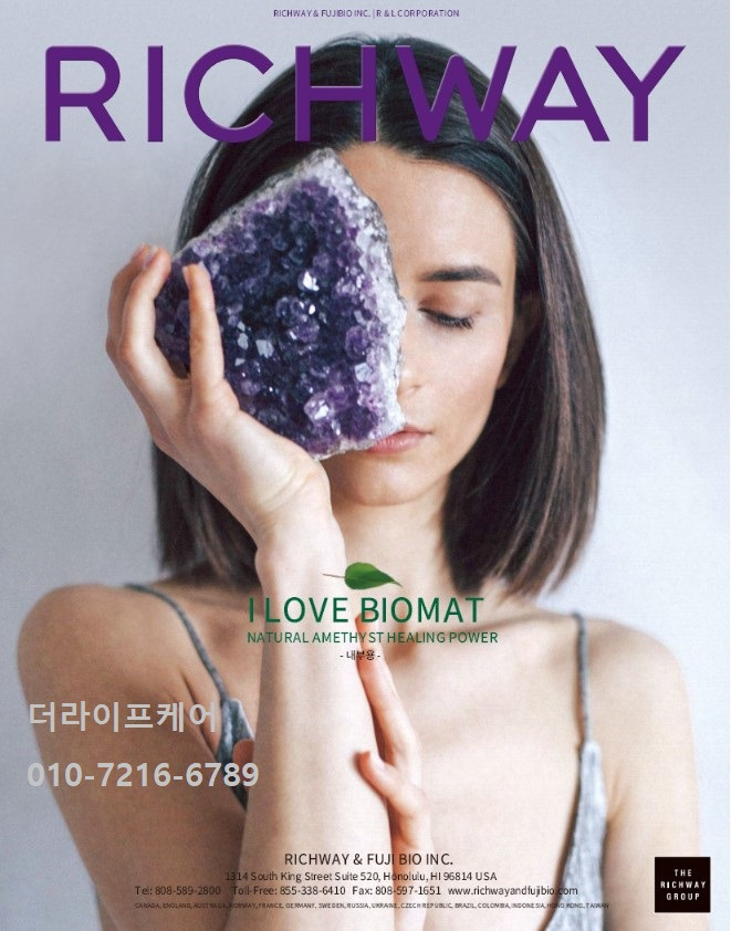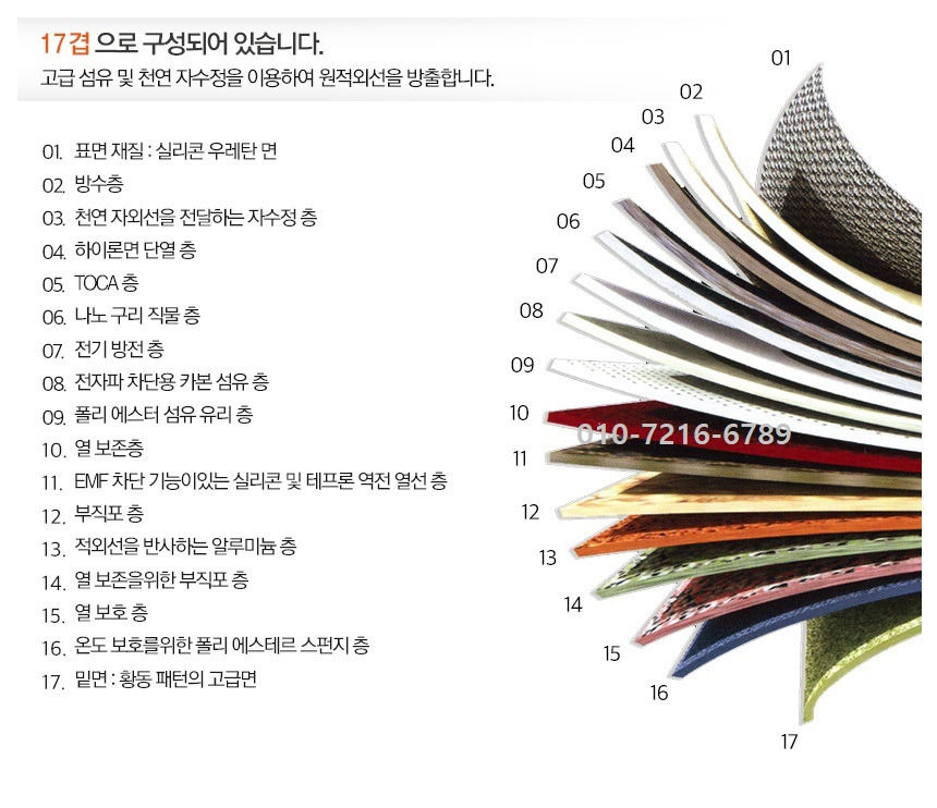 리치웨이 바이오매트는 총 17겹의 레이어로 제조 하였습니다, 여기에는 3단계의 전기 안전 기술과 특별한 원적외선을 기술적으로 발생할 수 있는 소재와 인체에 유익한 작용을 할 수 있는 소재들을 이용하였으며 마지막 단계에서는 천연 자수정을 탑재하여 제조 하였습니다,