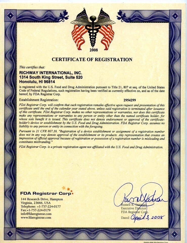 세계적으로 공신력이 높고 신뢰도가 높은 미국FDA로 부터 의료기기로 승인을 받았습니다, 참고로 미국 FDA에는 등록과 승인 2가지가 있습니다, 등록은 어떠한 제품이라도 정해진 규정에 부합되면 가능하지만 승인 과정은 의학적 효능이나 효과가 객관적 근거 자료에 의하여 입증이 되어야 하기에 매우 어렵고 까다로운 과정 입니다,