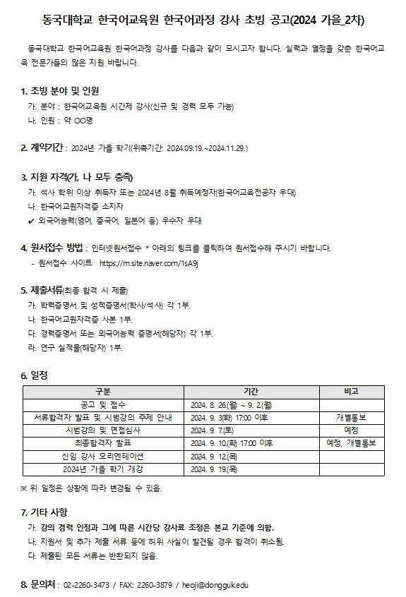 동국대학교 한국어교육원 강사 초빙 2차(~9/2) 작성자앙마|작성시간24.08.26|조회수38 목록 댓글 0 글자크기 작게가 글자크기 크게가 동국대학교 한국어교육원 한국어과정 강사 초빙 공고(2024 가을_2차) https://m.site.naver.com/1sA9jmain/loginsupport.dongguk.edu 다음검색 현재 게시글 추가 기능 열기 북마크 공유하기 신고 센터로 신고 댓글 댓글 0 댓글쓰기 답글쓰기 댓글 리스트