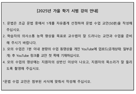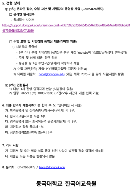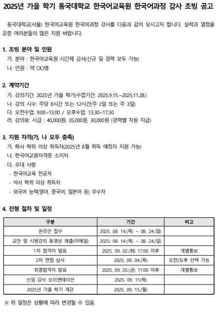 2025년 가을학기 동국대학교 한국어교육원 강사 초빙 공고(~8/24) 작성자앙마|작성시간25.08.14|조회수29 목록 댓글 0 글자크기 작게가 글자크기 크게가 3. 25_가을_시범강의 수업교안(양식).hwp29.00KB강사채용공고문_2025년 가을.pdf95.30KB[원서접수 사이트] https://support.dongguk.edu/unis/index.do?t=4D57593552584E5452546B3064485A6A624870565A314679596B4E525A7A3039[이메일 제출처] heoji@dongguk.edu 첨부파일첨부된 파일이 5개 있습니다. png 파일 KakaoTalk_20250814_093926595.png 다운로드 png 파일 KakaoTalk_20250814_093933413.png 다운로드 png 파일 KakaoTalk_20250814_093941157.png 다운로드 hwp 파일 3. 25_가을_시범강의 수업교안(양식).hwp 다운로드 pdf 파일 강사채용공고문_2025년 가을.pdf 다운로드 다음검색 현재 게시글 추가 기능 열기 북마크 공유하기 신고 센터로 신고 댓글 댓글 0 댓글쓰기 답글쓰기 댓글 리스트