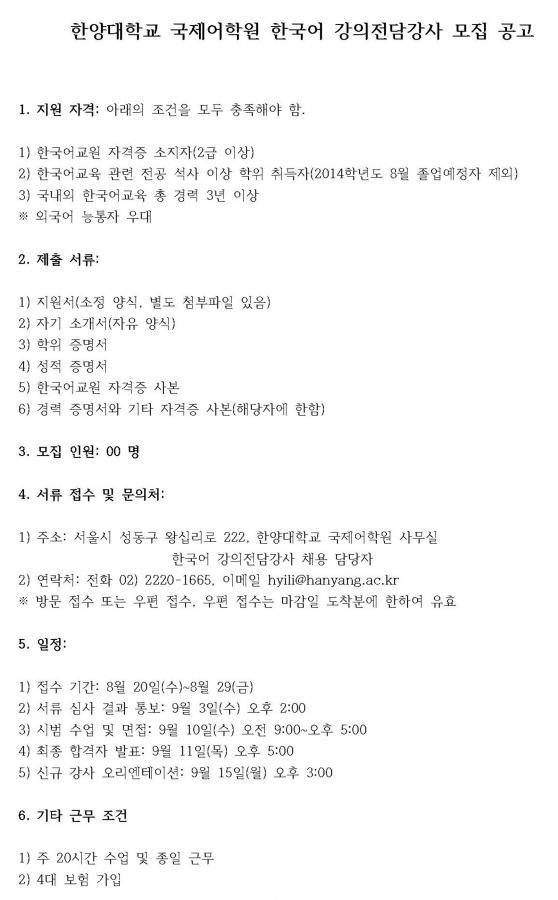 [국내대학]한양대 국제어학원 한국어 강의전담강사 모집(마감: 8월29일) 작성자카페지기|작성시간14.08.22|조회수292 목록 댓글 0 글자크기 작게가 글자크기 크게가 (한양대)한국어강사지원서.hwp 첨부파일첨부된 파일이 2개 있습니다. jpg 파일 14082109403507_1[1].jpg 다운로드 hwp 파일 (한양대)한국어강사지원서.hwp 다운로드 다음검색 현재 게시글 추가 기능 열기 북마크 공유하기 신고 센터로 신고 댓글 댓글 0 댓글쓰기 답글쓰기 댓글 리스트