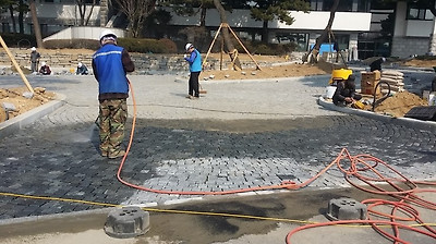 어떠세요 좀 다르죠? 사고석 포장의 핵심은 줄눈메지 인대 기존의 몰탈메지 방법으로는 차량의 이동시 사고석의 이탈 현상이 많이 발생하게 됩니다.