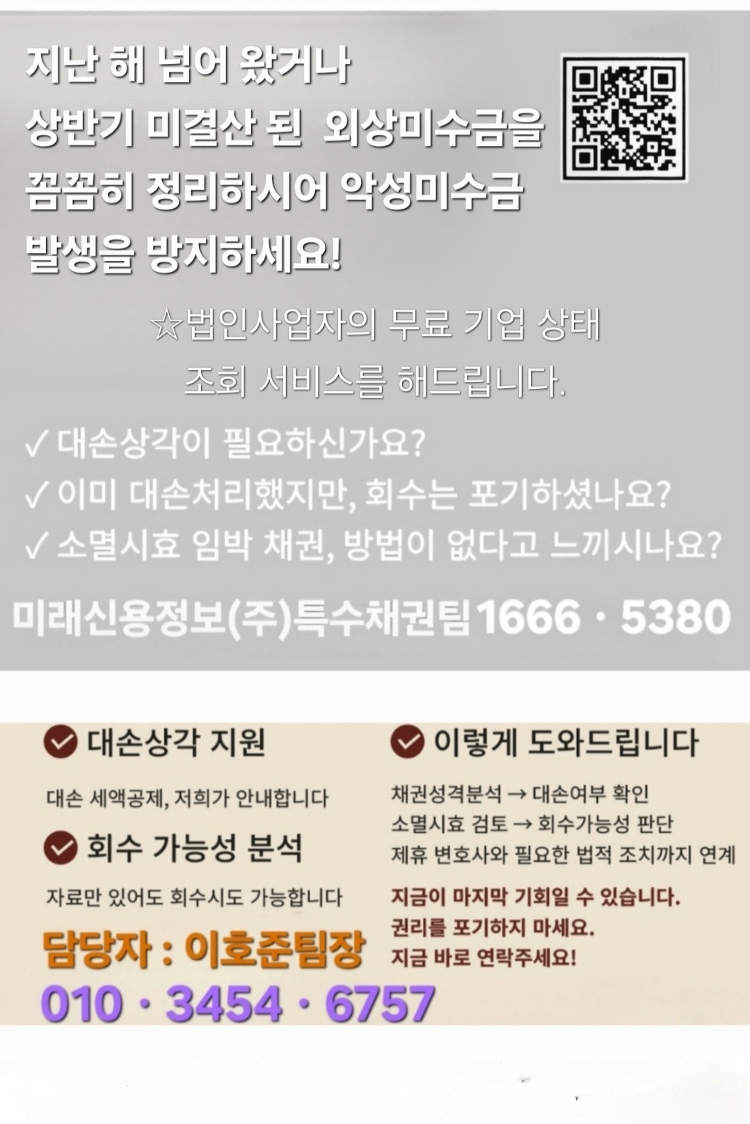 사업과 시공만 신경쓰시고 채권은 후불(성공수수료)로 맡겨주세요 작성자채권|작성시간25.07.07|조회수18 목록 댓글 0 글자크기 작게가 글자크기 크게가 다음검색 현재 게시글 추가 기능 열기 북마크 공유하기 신고 센터로 신고 댓글 댓글 0 댓글쓰기 답글쓰기 댓글 리스트