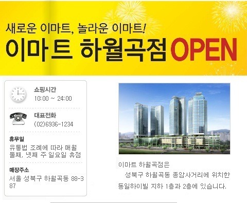 이마트 하월곡점 오픈(2012.05)~ 위치 작성자카폐관리자|작성시간12.06.05|조회수617 목록 댓글 0 글자크기 작게가 글자크기 크게가 주변,지역의 대형 유통 업체 오픈 안내이며 이용을 권장 하는 것은 아닙니다. 울 아파트 [벽산상가] 주변 [전통시장] 많이, 마~니 가지고 자주 사♥랑 합시다~^^ 다음검색 현재 게시글 추가 기능 열기 북마크 공유하기 신고 센터로 신고 댓글 댓글 0 댓글쓰기 답글쓰기 댓글 리스트