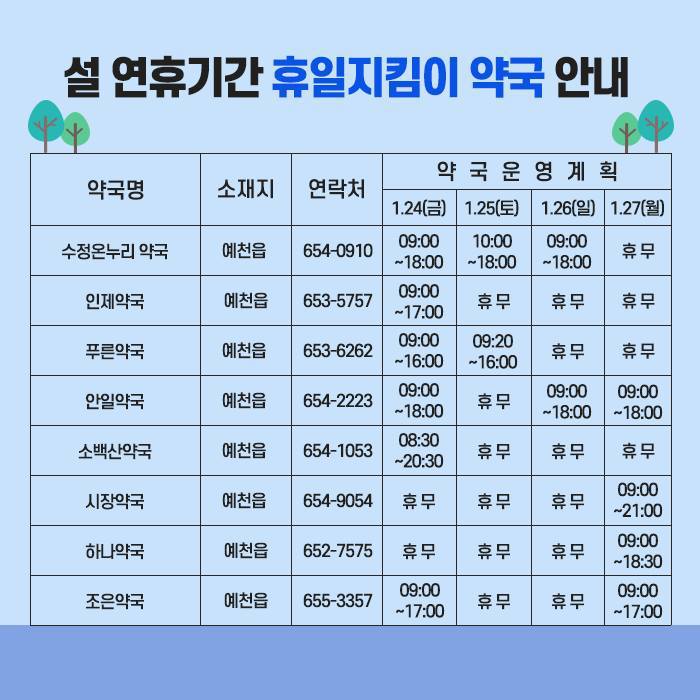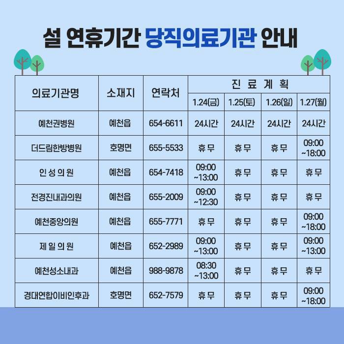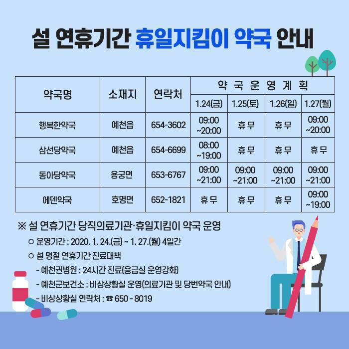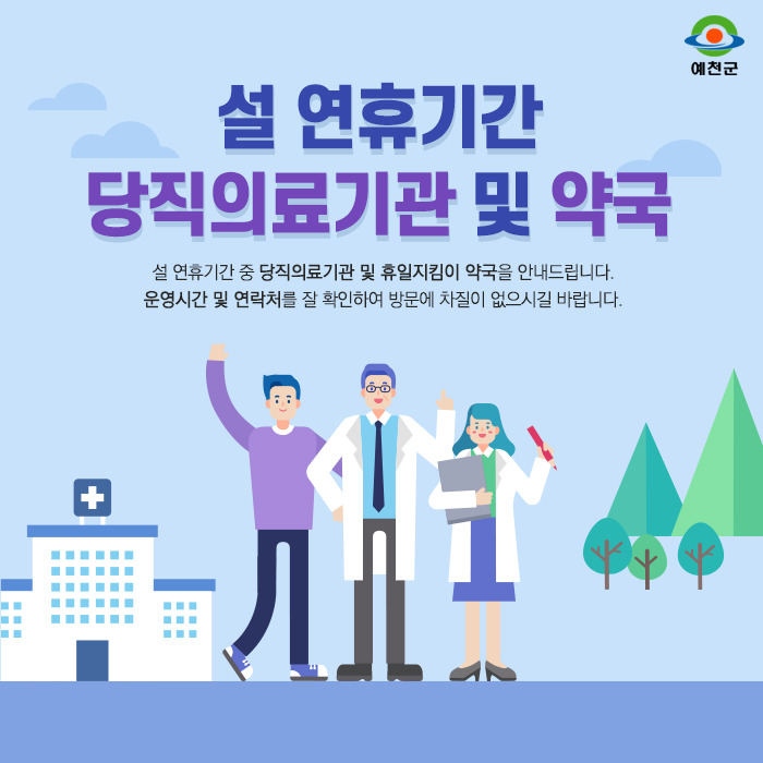 설연휴 예천 당직의료기관 및 약국 안내 작성자예천사랑|작성시간20.01.21|조회수19 목록 댓글 0 글자크기 작게가 글자크기 크게가 ★ YECHEON NEWS! ★설 연휴기간 당직의료기관 및 약국 안내! 운영시간 및 연락처를 잘 확인하여 방문에 차질이 없으시길 바랍니다☝( ◠‿◠ )☝ 다음검색 현재 게시글 추가 기능 열기 북마크 공유하기 신고 센터로 신고 댓글 댓글 0 댓글쓰기 답글쓰기 댓글 리스트