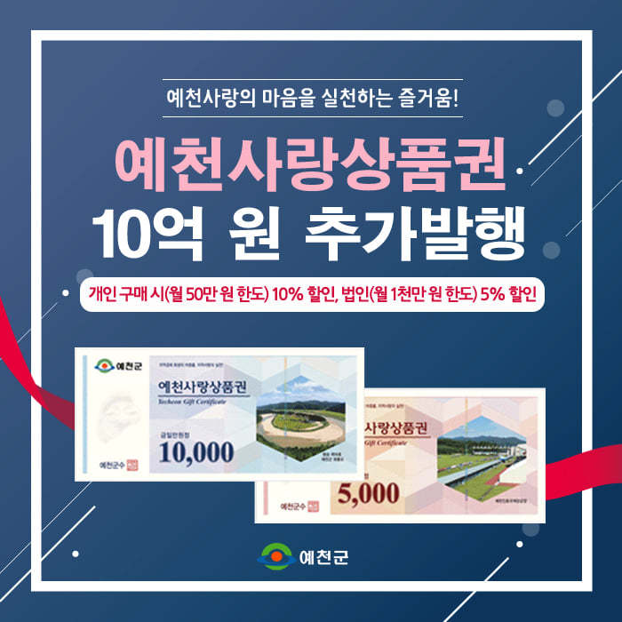 예천사랑상품권 추가발행 안내 작성자예천사랑|작성시간19.10.08|조회수37 목록 댓글 0 글자크기 작게가 글자크기 크게가 ★ YECHEON NEWS! ★예천사랑의 마음을 실천하는'예천사랑상품권' 지역 경제 활성화에 군민 여러분의 큰 관심으로 예천상품권 유통이 성공을 거뒀어요! 다음검색 현재 게시글 추가 기능 열기 북마크 공유하기 신고 센터로 신고 댓글 댓글 0 댓글쓰기 답글쓰기 댓글 리스트