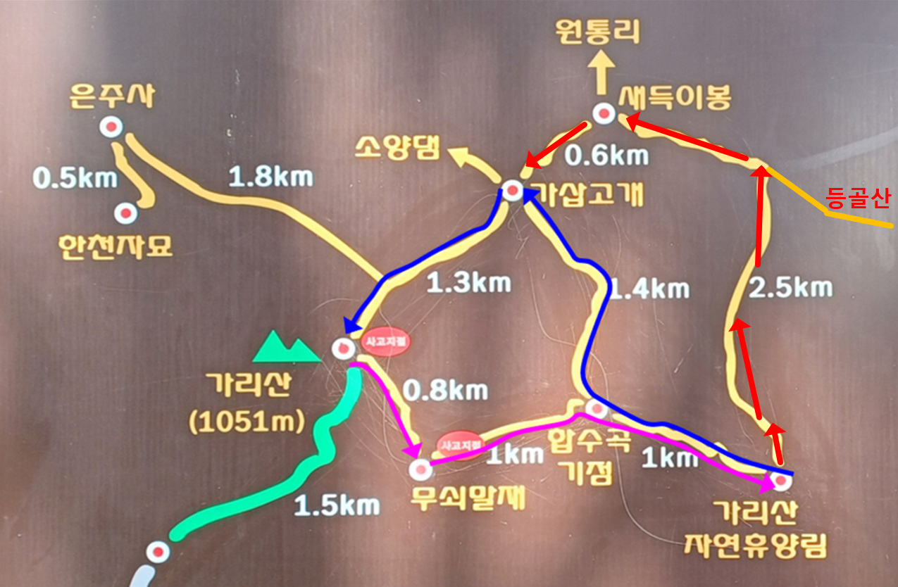 주차장-새득이봉-가삽고개-가리산(1,051m)-무쇠말재-주차장( 10.2km, 5시간 )