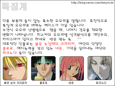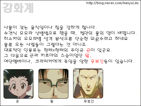 레오리오는 강화계가 아닙니다. 저도 처음에 강화계에 넣었다가, 헌터x헌터 공식가이드북에 방출계로 나와서 급히 수정했습니다. 아직 애니나, 원작에선 별다른 언급이 없기에 빼놓은 것입니다. 원작에서 레오리오가 강화계라고 한것은 확실한게 아니라, 성격으로 따져본 곤일행의 추측이었답니다.^^;