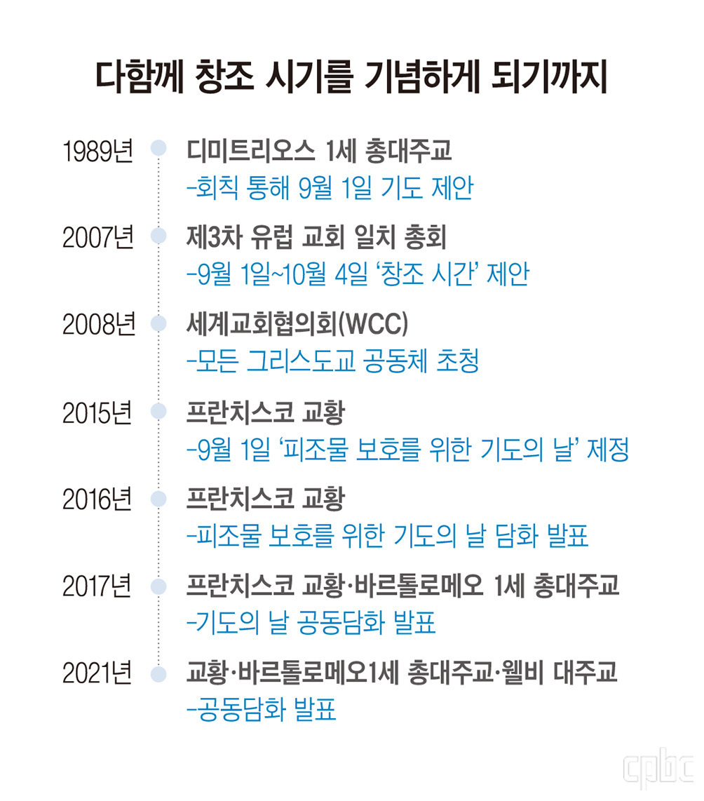교황은 그해 5월 24일 인준하고 6월 18일 발표한 회칙 「찬미받으소서」에도 정교회와의 연대를 표명했다. 7~9항에 바르톨로메오 1세 세계 총대주교의 피조물 보호를 위한 기도의 날 담화를 인용한 것이다. 바르톨로메오 1세는 1991년 착좌 때부터 줄곧 담화를 내며 생태환경 보호를 촉구해 ‘녹색 총대주교’라고 불리는 인물이다. 프란치스코 교황은 이듬해인 2016년부터 9월 1일 피조물 보호를 위한 기도의 날 담화를 발표했다. 동시에 가톨릭교회도 이날부터 10월 4일까지 창조 시간으로 지내기 시작했다. 가톨릭교회의 동참은 ‘창조 시기(Season of Creation)’로 바꿔 부르는 계기가 됐다.