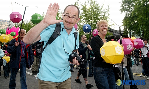 | ▲ 조계사 앞길에서 펼쳐진 체험마당엔 서양인들이 눈에 많이 띄었습니다. 꼬마 연등 만들기에 열중하는 외국인 | |||||||||||||||||||||||||