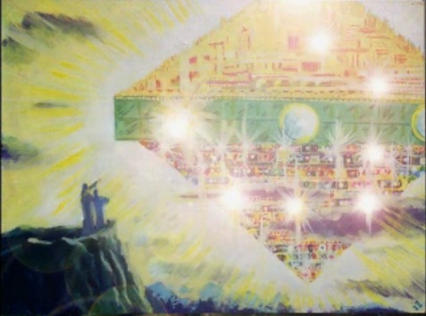 이 도성은 네모 반듯한 이중 피라미드 형태로 입방체 두개가 붙어 있는 이중 입방체 형상인데 여덟 면과 두 바닥을 갖고 있습니다. 이 도성은 어디에 위치하든지 회전의(儀)처럼 균형을 유지할 수 있습니다. 길이, 너비, 높이가 일만이천 스타디온(펄롱)(1펄롱은 201.17m)으로서 2,414km 정도 되고, 성벽의 높이는 80m 정도 됩니다. 이것은 도성이라기보다 소행성 같은 크기인데 구성성분은 맑은 유리같은 순금이 주를 이루고 있고 성벽은 "벽옥"으로 되어 있습니다. 생명체의 구성 성분인 탄소가 함유된 벽옥으로 되어 있습니다. 이 도성은 살아 숨쉬는 "친환경" 도성입니다.