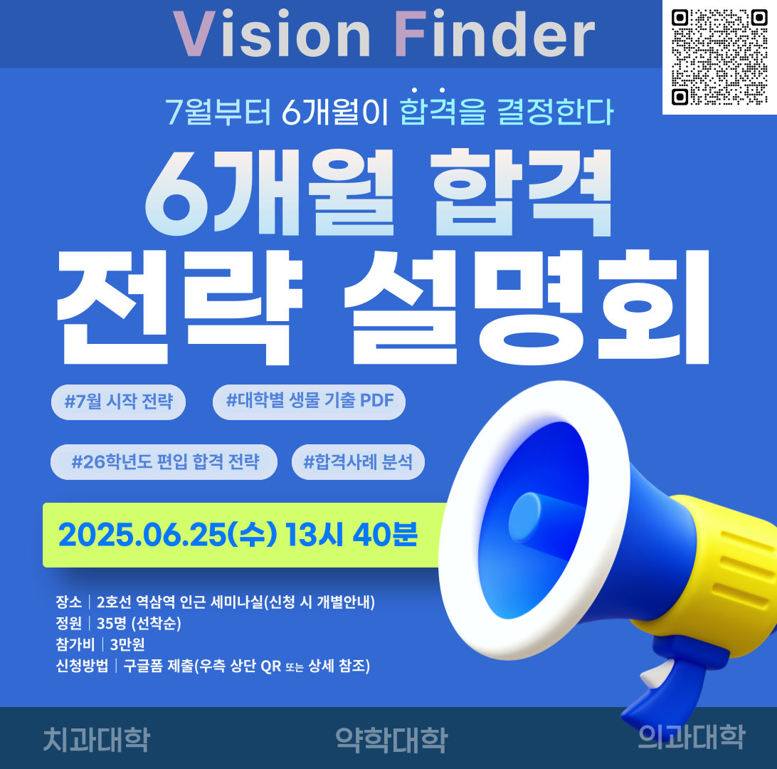 비전파인더의 전략 설명회에 참석하는 것만으로도, 여러분들은 입시의 차별화된 경쟁력을 가질 수 있습니다.
