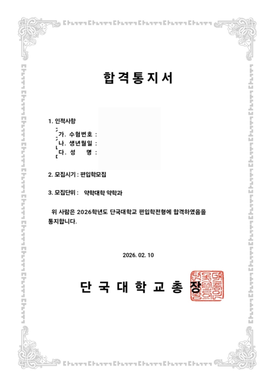 후기를 보니 병원 봉사활동까지 성실히 챙기며 그 치열한 노력들이 느껴져서 선생님도 정말 뿌듯하고 행복합니다. 스스로 '큰일 한번 내겠다'고 느꼈던 그 확신이 결국 합격이라는 확정된 결과로 돌아왔네요! 이제 약사로서 새로운 출발을 하게 될 텐데, 이번 입시에서 보여준 성실함과 태도라면 약대 가서도 누구보다 훌륭하게 잘해낼 거라 믿어 의심치 않습니다 :) 그동안 선생님 믿고 가이드 준 대로 잘 따라와 줘서 정말 고맙고 수고 많았어요.새로운 약대 생활 즐겁고 행복하게 잘 보내길 바랍니다! 다시 한번 단국대 합격 넘넘 축하해요!!^^ -