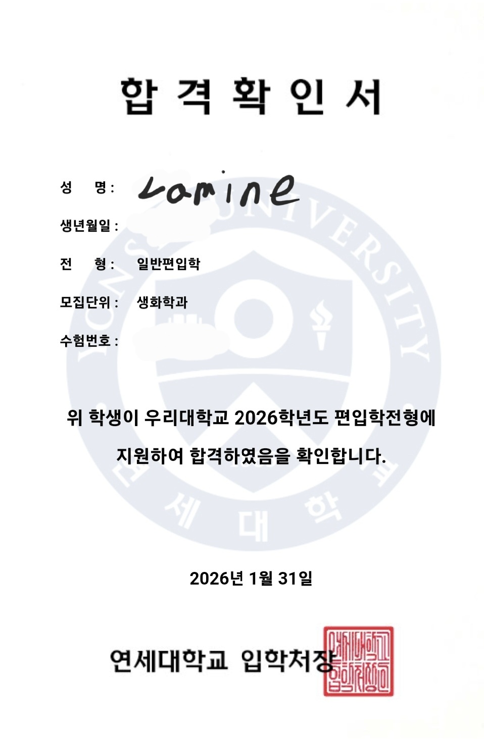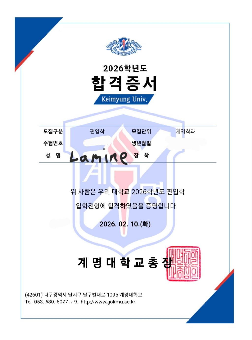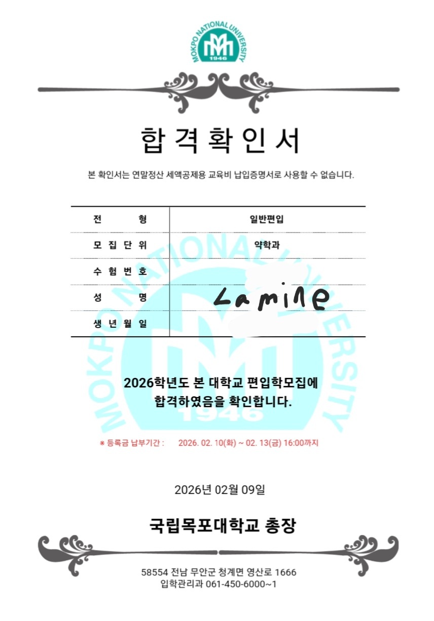 작성자VF민동준T 작성시간 26.02.25 Lamine님, 계명대 제약학과 등 3관왕 합격을 진심으로 축하드립니다!