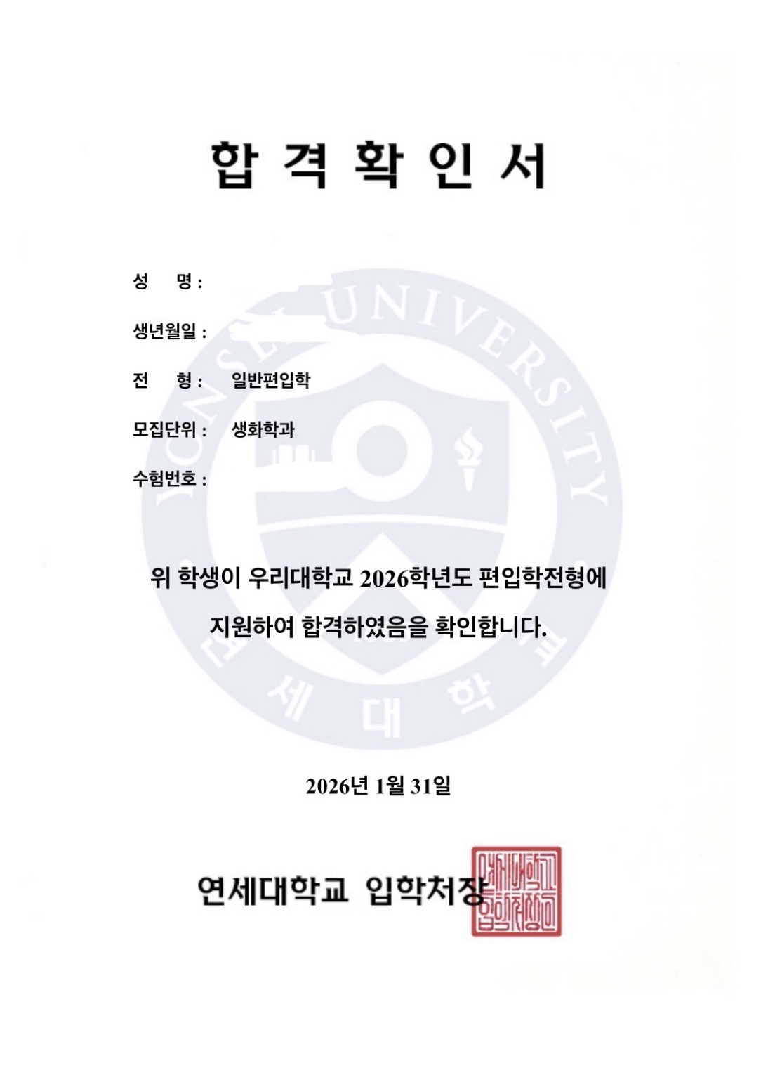작성자VF민동준T 작성시간 26.02.25 초시라는 쉽지 않은 조건 속에서도 연세대 생화학과와 단국대 약학과 2관왕이라는 엄청난 쾌거를 이루어내신 것을 진심으로 축하드립니다!