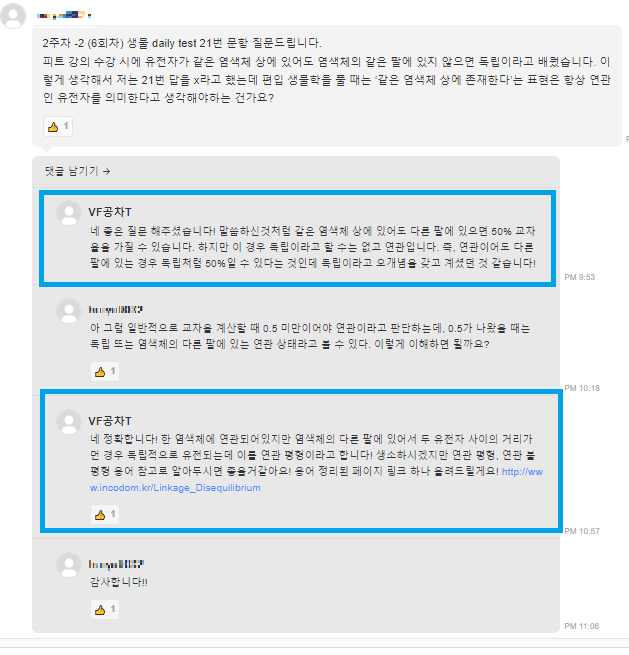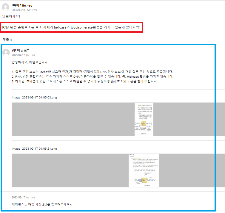 그래서 궁금한 사항을 추가적으로 얼마든지 질문할 수 있도록 4개월 합격반 전용 질의응답 앱의 질의응답 시스템을 운영하고 있습니다. VF 생물 담당(바닐로T, 공차T) 선생님들께서 24시간 내로 빠르게 답변 주시니, 합격을 향한 열정에 시너지 효과가 발생하고 있는 것 같습니다^^ (레퍼런스 자료까지 꼼꼼하게 챙겨주셨네요!!)