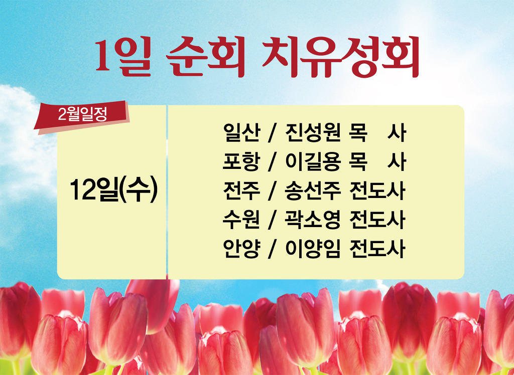 작성자임재의 불 작성시간 14.01.29 주님이 1일 순회 치유성회를 통해 행하실 역사들을 기대합니다. 주님의 영광이 충만한 집회 되게 하소서! 치유를 통해 많은 분들이 주님을 깊이 체험하는 은혜의 시간들이 될 줄 믿습니다.