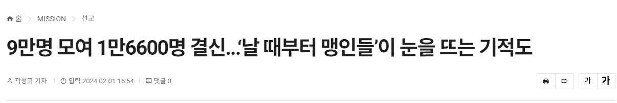 "9만명 모여 1만6600명 결신...‘날 때부터 맹인들’이 눈을 뜨는 기적도"(자유일보 2024년 2월 1일자 기사)