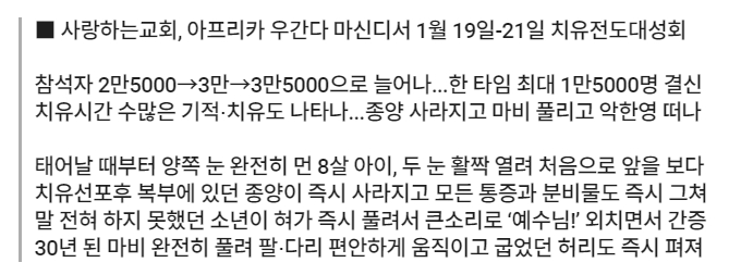 작성자『사랑하는교회』작성시간24.02.02조회수594 목록 댓글 19 국내에 본부를 둔 한 멀티사이트 처치(Multi-Site Church, 한 교회가 여러 곳에 모이는 형태의 교회 모델)가 최근 아프리카 우간다 한 지역에서 연 3일간의 치유전도대성회에서 9만명이 모이고 1만6600명이 결신하는 영혼구원의 역사가 일어났다. 태어날 때부터 맹인이었던 몇몇 참석자들이 눈을 뜨게 되는 등의 놀라운 기적과 치유도 나타났다.
