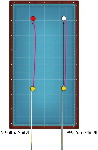 반대로 빠른속도로 회전을 많이 주고 치면 커브의 영향력이 작용하여 스쿼드를 상쇄하기 전에 1목적구를 맞게 됩니다. 따라서 스쿼드 영량력이 크게 되는 것이죠..