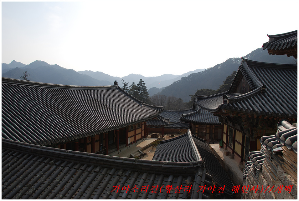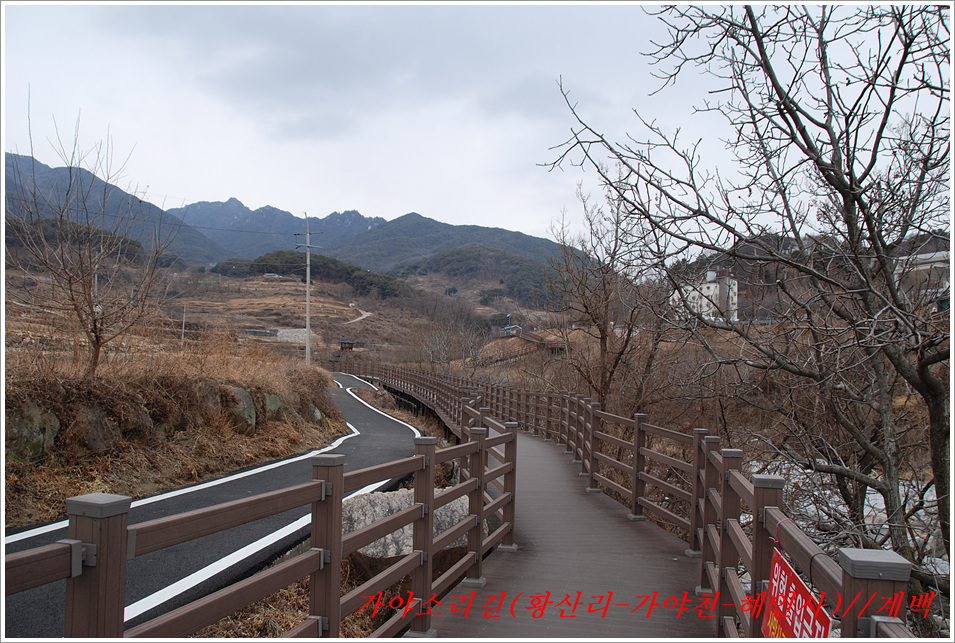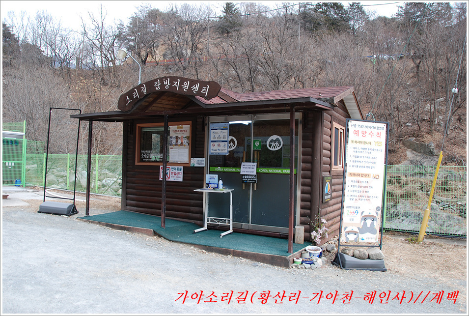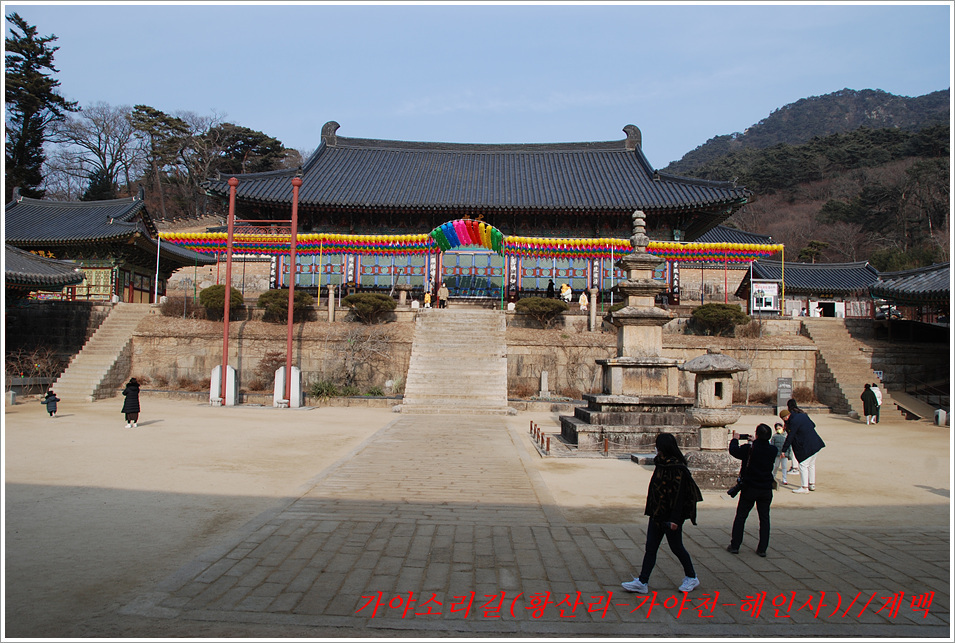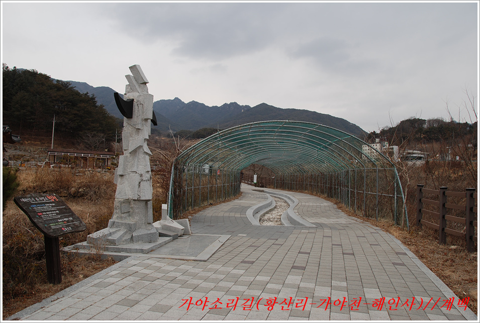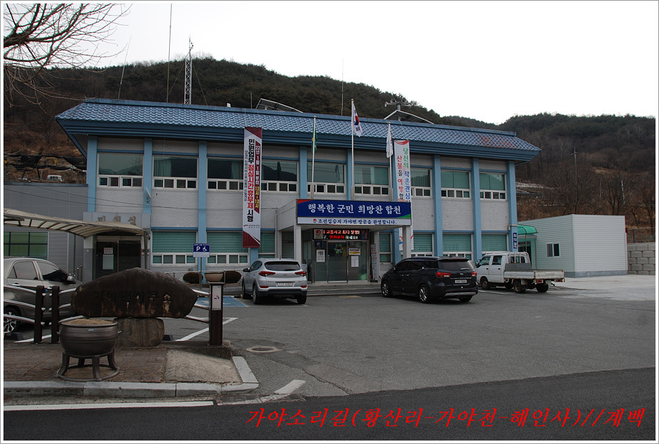 -해인사 소리길에서 바라본 가야산, 법보종찰 헤인사 풍경- 가야산<홍류동계곡의 해인사소리길 트레킹> 제2022018018호 2022-02-19(토) ◆자리한 곳 : 경남, 합천군, 경북, 성주군 ◆지나온 길 : 청량사입구-가야산국립공원사무실-가야면사무소-소리길 분기점-황산주차장-소리길탐방센터-홍류동계곡-해인사홍류문-농산정-길상사-성철스님부도-해인사(팔만대장경)-치인주차장 ◆거리및시간: 5시간 41분(10:56~16:37) ※ 도상거리 : 약 14,3km 보행수(步行數) : 21,807보 ◆함께한 이 : 다음매일 산악회원 : 27명 ◆산행 날씨 : 비교적 맑음 <해 뜸 07:18 해 짐 18:15 / ‘최저 -2도, 최고 8도> -소리길에 들어서기 전에 가야면 소재지 부터 돌아본다- 명산을 찾아다니면 좋은 점도 많으나 불편함도 있기 마련인가 보다 명산이나 기초단체에서 관리하는 산행코스는 잘 정비되어 비교적 안전하며 자료가 넘치는 좋은 점도 많으나 불편함은 상대적으로 많은 사람들이 찾아 한산하거나 사색하기엔 적합하지 않다는 점인데 오늘 홍류동계곡 소리기를 찾는 까닭은 간단하다. 가야산백운산 코스와 남산제일봉은 얼마 전에 다녀왔으므로 미답지인 해인사소리길를 계획한다. 산악회에서 공지한대로 황산주차장에서 시작하면 너무 짧고 난이도가 낮아 양이 차지 않았으므로 거리와 시간을 최대한으로 늘리려고 황산주차장입구에서 버스로 달려왔던 도로를 거슬러 가야면소제지로 내려가며 가야산국립공원사무실을 지나 야천삼거리에서 9번국도를 만나 가야면소제지(면사무소), 가야농협 갈림길에서 황산교지나 소리길분기점 안내판에서 홍류동계곡과 멀어졌다 가까워지기를 반복하는 해인사소리길 트레킹에 돌입니다. -소리길에 들어서 만난 안내판 풍경- 빈차로 치인주차장으로 가는 기사가 매표소에서 마찰을 없애려고 문화재 관람료를 자진납부 한다. ① 가야산코스 : 백운동-만물상-서장대-서석재-칠불봉-가야산-해인사-치인주차장(약10km) ② 남산제일봉 : 황산주차장-황산저수지-청량사-전망대-남산제일봉-안부-돼지골-치인주차장(약8km) ③ 해인사소리길 : 황산주차장-홍류동계곡-해인사-치인주차장-해인사(약6km) 지난번 백운동에서 산행을 시작하며 문화재관람료를 징수하지 않기에 무심코 버스기사에게 치인주장에서 대기하면 된다고 보냈는데 10여분 만에 입장료 때문에 통과시키지 않는다는 연락을 받고 매표소에 근무하는 직원과 입씨름하느라 마음만 상하고 결국은 승차인원을 계산해 기사에게 납부하고 통과하기를 부탁했고, 하산해 징수하느라 불편했던 경험을 참고해서, 오늘은 황산주차장입구에서 빈차로 올려 보내며 승차명단과 입장료를 챙겨(경로우대자는 신분증, 나머지는 현금으로) 보냈다. 문화재관람료(통행세) : “정청래 의원은 ‘문화재관람료’를 ‘사찰입장료’로 잘못 알고 사찰통행세라 주장하지만, 대한민국에서 ‘사찰입장료’를 받는 곳은 없으며, 문화재보호법에 따라 문화재관람료를 징수하고 있음이 명백한 사실임을 왜곡해서 주장하고 있다” ‘사찰입장료’ 받는 곳이 없나? 문화재관람료는 징수 32년 만인 지난 2019년 4월 폐지됐다. 2013년 광주고법에서 통행의 자유 침해로 불법행위라는 판단을 내렸다. 2015년 대법원은 등산객을 사찰관람자로 취급해서 관람료를 징수하면 안 된다고 판결했다. 법원 판결에도 불구하고 사찰 측은 계속 버티다가 2019년 4월 폐지에 합의했다. 호남의 내장산 내장사, 백암산 백양사, 월출산 도갑사, 변산 내소사와 설악산 신흥사 오대산 월정사 등 들어본 적 많은 국립공원 전통사찰들이 지금도 문화재 관람료를 받고 있다. 2019년 기준 국립공원 내 문화재관람료 징수 사찰은 총 23곳이다. 국립공원 안에 있으면서도 관람료를 받지 않는 곳은 4곳으로 덕유산 백련사·안국사, 설악산 백담사, 그리고 지리산 천은사 등이다. 국립공원이 아닌 사찰이 등산로 입구에서 징수하는 것까지 포함하면 전국적으로 60곳이 넘는다. 징수비용은 적게는 1000원부터 많게는 5000원까지 천차만별이다. 매표소는 대부분이 국립공원 입구 혹은 등산로 입구에 있다. 현실이 이렇다보니 순수하게 등산을 하는 사람들도 문화재관람료를 내야 하는 모순에 처하게 된다. 문화재보호법 제49조에 문화재 소유자가 시설을 공개할 경우 관람료를 받을 수 있다고 명시돼 있어서다. -김용택의 참교육이야기- 해인사 소리길이란? : 경남 합천군 가야면 해인사길 홍류동계곡 일대의 마음을 순화하는 자아의 길이다. 해인사 오르는 길의 홍류동 계곡은 계절마다 경관을 달리한다. 특히 가을 단풍이 너무 붉어서 흐르는 물조차 붉게 보인다 하여 홍류동(紅流洞)이라 불리운다. 천년의 고고한 세월을 담은 이길은 오늘날 ‘해인사소리길’이라는 이름으로 다시 태어나 세파에 시달린 여행객을 자연의 품속으로 안내한다. 길은‘대장경천년세계문화축전’행사장인 야천리에서 해인사까지 6km 남짓 이어진다. 수백년 된 송림 숲 속에서 뿜어 나오는 신선한 공기와 웅장한 바위를 휘감아도는 청아한 물길과 폭포, 산새 소리와 해인사의 풍경소리로 마음을 씻어내고 깊은 사색하기에 더없이 좋은 길이다. •대장경천년관 → 홍류동