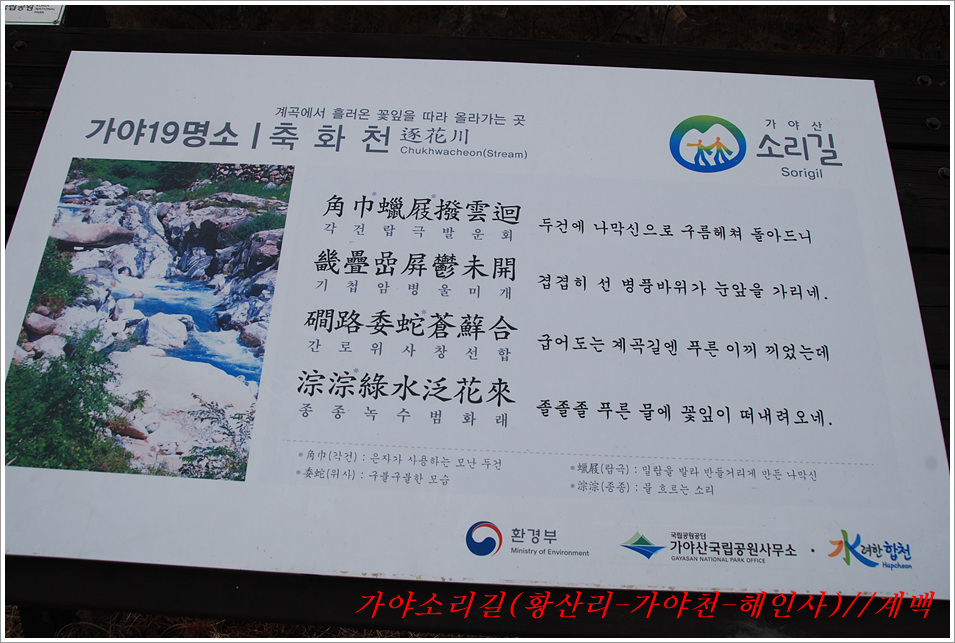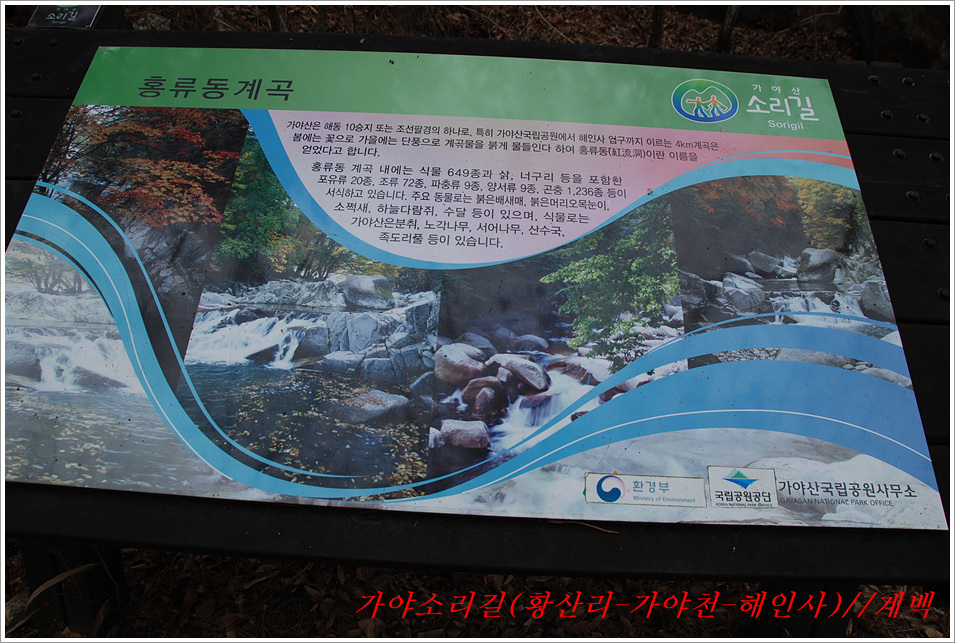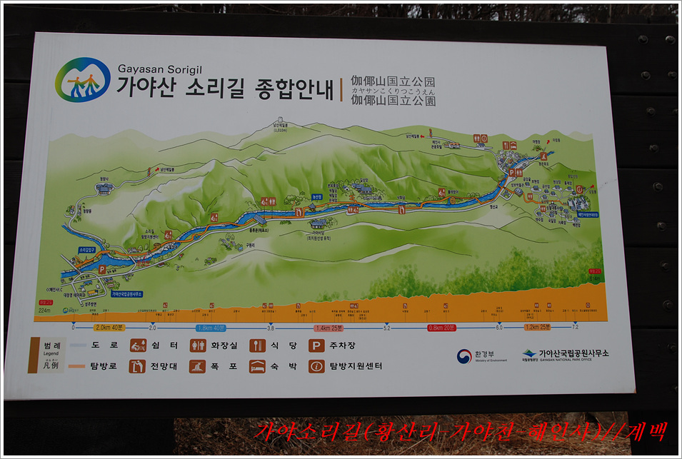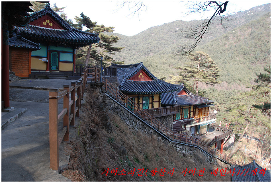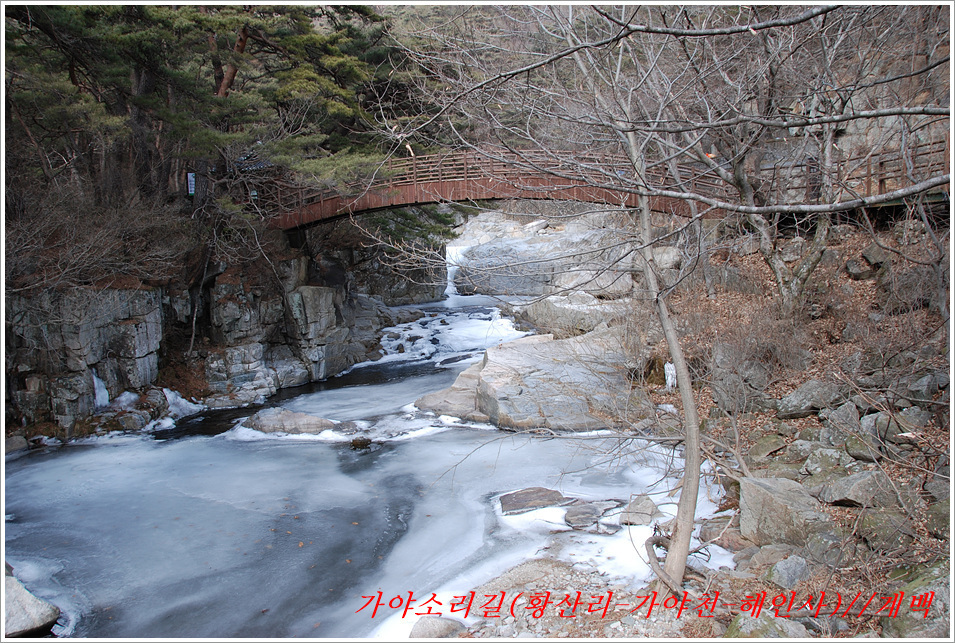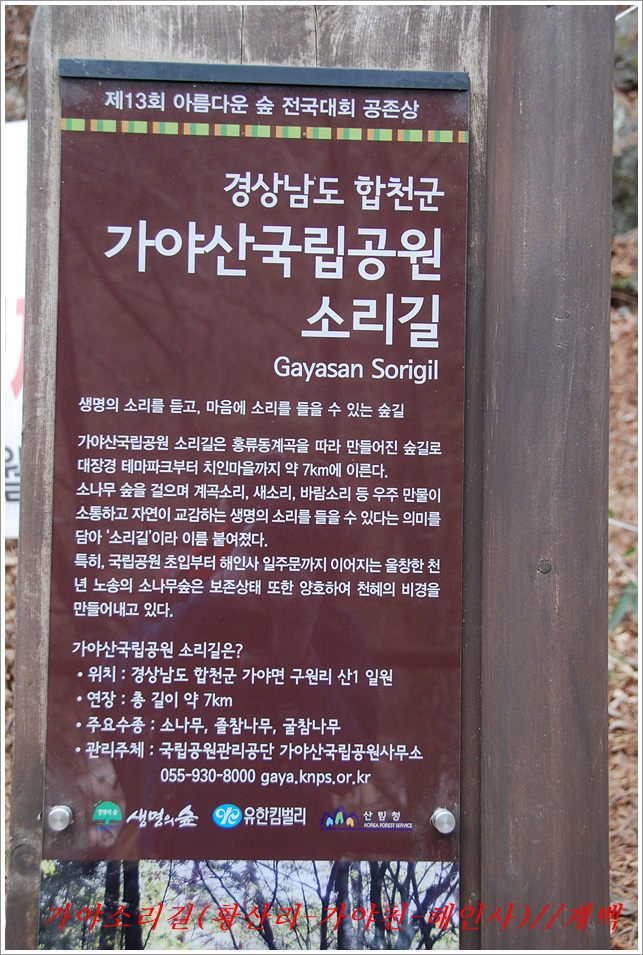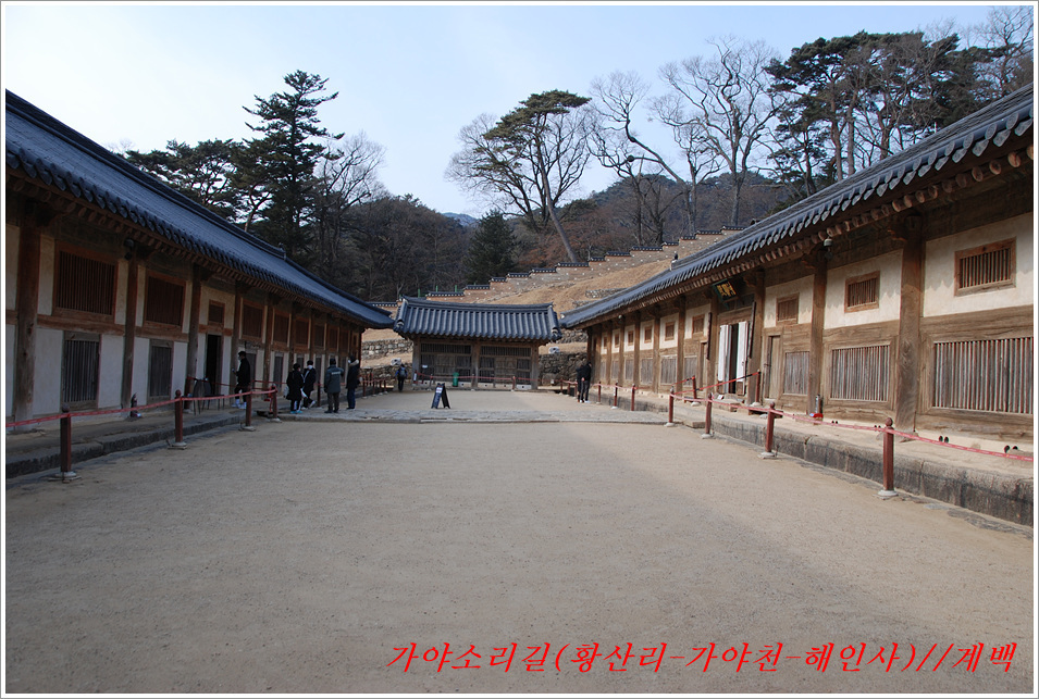 -해인사 소리길에서 바라본 가야산, 법보종찰 헤인사 풍경- 가야산<홍류동계곡의 해인사소리길 트레킹> 제2022018018호 2022-02-19(토) ◆자리한 곳 : 경남, 합천군, 경북, 성주군 ◆지나온 길 : 청량사입구-가야산국립공원사무실-가야면사무소-소리길 분기점-황산주차장-소리길탐방센터-홍류동계곡-해인사홍류문-농산정-길상사-성철스님부도-해인사(팔만대장경)-치인주차장 ◆거리및시간: 5시간 41분(10:56~16:37) ※ 도상거리 : 약 14,3km 보행수(步行數) : 21,807보 ◆함께한 이 : 다음매일 산악회원 : 27명 ◆산행 날씨 : 비교적 맑음 <해 뜸 07:18 해 짐 18:15 / ‘최저 -2도, 최고 8도> -소리길에 들어서기 전에 가야면 소재지 부터 돌아본다- 명산을 찾아다니면 좋은 점도 많으나 불편함도 있기 마련인가 보다 명산이나 기초단체에서 관리하는 산행코스는 잘 정비되어 비교적 안전하며 자료가 넘치는 좋은 점도 많으나 불편함은 상대적으로 많은 사람들이 찾아 한산하거나 사색하기엔 적합하지 않다는 점인데 오늘 홍류동계곡 소리기를 찾는 까닭은 간단하다. 가야산백운산 코스와 남산제일봉은 얼마 전에 다녀왔으므로 미답지인 해인사소리길를 계획한다. 산악회에서 공지한대로 황산주차장에서 시작하면 너무 짧고 난이도가 낮아 양이 차지 않았으므로 거리와 시간을 최대한으로 늘리려고 황산주차장입구에서 버스로 달려왔던 도로를 거슬러 가야면소제지로 내려가며 가야산국립공원사무실을 지나 야천삼거리에서 9번국도를 만나 가야면소제지(면사무소), 가야농협 갈림길에서 황산교지나 소리길분기점 안내판에서 홍류동계곡과 멀어졌다 가까워지기를 반복하는 해인사소리길 트레킹에 돌입니다. -소리길에 들어서 만난 안내판 풍경- 빈차로 치인주차장으로 가는 기사가 매표소에서 마찰을 없애려고 문화재 관람료를 자진납부 한다. ① 가야산코스 : 백운동-만물상-서장대-서석재-칠불봉-가야산-해인사-치인주차장(약10km) ② 남산제일봉 : 황산주차장-황산저수지-청량사-전망대-남산제일봉-안부-돼지골-치인주차장(약8km) ③ 해인사소리길 : 황산주차장-홍류동계곡-해인사-치인주차장-해인사(약6km) 지난번 백운동에서 산행을 시작하며 문화재관람료를 징수하지 않기에 무심코 버스기사에게 치인주장에서 대기하면 된다고 보냈는데 10여분 만에 입장료 때문에 통과시키지 않는다는 연락을 받고 매표소에 근무하는 직원과 입씨름하느라 마음만 상하고 결국은 승차인원을 계산해 기사에게 납부하고 통과하기를 부탁했고, 하산해 징수하느라 불편했던 경험을 참고해서, 오늘은 황산주차장입구에서 빈차로 올려 보내며 승차명단과 입장료를 챙겨(경로우대자는 신분증, 나머지는 현금으로) 보냈다. 문화재관람료(통행세) : “정청래 의원은 ‘문화재관람료’를 ‘사찰입장료’로 잘못 알고 사찰통행세라 주장하지만, 대한민국에서 ‘사찰입장료’를 받는 곳은 없으며, 문화재보호법에 따라 문화재관람료를 징수하고 있음이 명백한 사실임을 왜곡해서 주장하고 있다” ‘사찰입장료’ 받는 곳이 없나? 문화재관람료는 징수 32년 만인 지난 2019년 4월 폐지됐다. 2013년 광주고법에서 통행의 자유 침해로 불법행위라는 판단을 내렸다. 2015년 대법원은 등산객을 사찰관람자로 취급해서 관람료를 징수하면 안 된다고 판결했다. 법원 판결에도 불구하고 사찰 측은 계속 버티다가 2019년 4월 폐지에 합의했다. 호남의 내장산 내장사, 백암산 백양사, 월출산 도갑사, 변산 내소사와 설악산 신흥사 오대산 월정사 등 들어본 적 많은 국립공원 전통사찰들이 지금도 문화재 관람료를 받고 있다. 2019년 기준 국립공원 내 문화재관람료 징수 사찰은 총 23곳이다. 국립공원 안에 있으면서도 관람료를 받지 않는 곳은 4곳으로 덕유산 백련사·안국사, 설악산 백담사, 그리고 지리산 천은사 등이다. 국립공원이 아닌 사찰이 등산로 입구에서 징수하는 것까지 포함하면 전국적으로 60곳이 넘는다. 징수비용은 적게는 1000원부터 많게는 5000원까지 천차만별이다. 매표소는 대부분이 국립공원 입구 혹은 등산로 입구에 있다. 현실이 이렇다보니 순수하게 등산을 하는 사람들도 문화재관람료를 내야 하는 모순에 처하게 된다. 문화재보호법 제49조에 문화재 소유자가 시설을 공개할 경우 관람료를 받을 수 있다고 명시돼 있어서다. -김용택의 참교육이야기- 해인사 소리길이란? : 경남 합천군 가야면 해인사길 홍류동계곡 일대의 마음을 순화하는 자아의 길이다. 해인사 오르는 길의 홍류동 계곡은 계절마다 경관을 달리한다. 특히 가을 단풍이 너무 붉어서 흐르는 물조차 붉게 보인다 하여 홍류동(紅流洞)이라 불리운다. 천년의 고고한 세월을 담은 이길은 오늘날 ‘해인사소리길’이라는 이름으로 다시 태어나 세파에 시달린 여행객을 자연의 품속으로 안내한다. 길은‘대장경천년세계문화축전’행사장인 야천리에서 해인사까지 6km 남짓 이어진다. 수백년 된 송림 숲 속에서 뿜어 나오는 신선한 공기와 웅장한 바위를 휘감아도는 청아한 물길과 폭포, 산새 소리와 해인사의 풍경소리로 마음을 씻어내고 깊은 사색하기에 더없이 좋은 길이다. •대장경천년관 → 홍류동