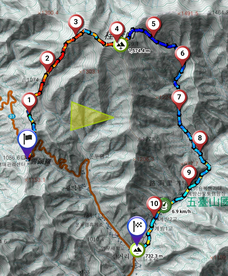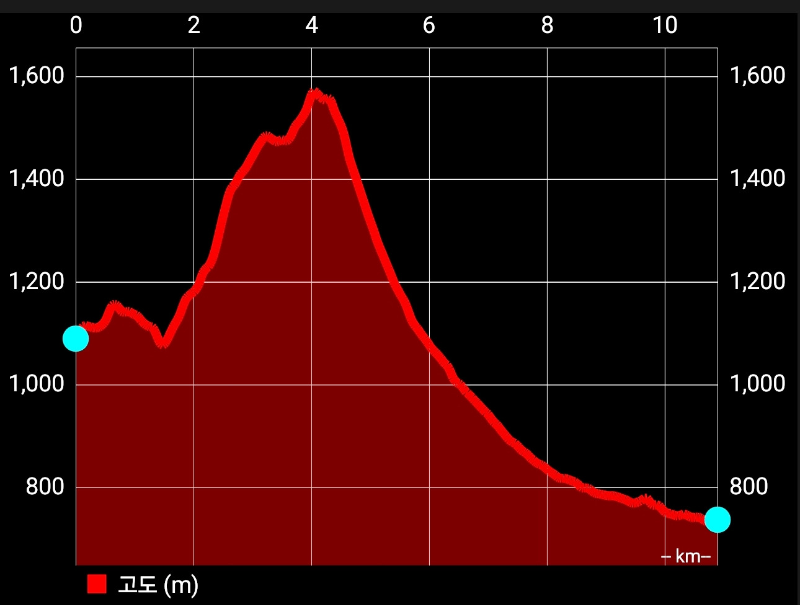 최저고도: 732 m (운두령 고도: 약 1090 m)
