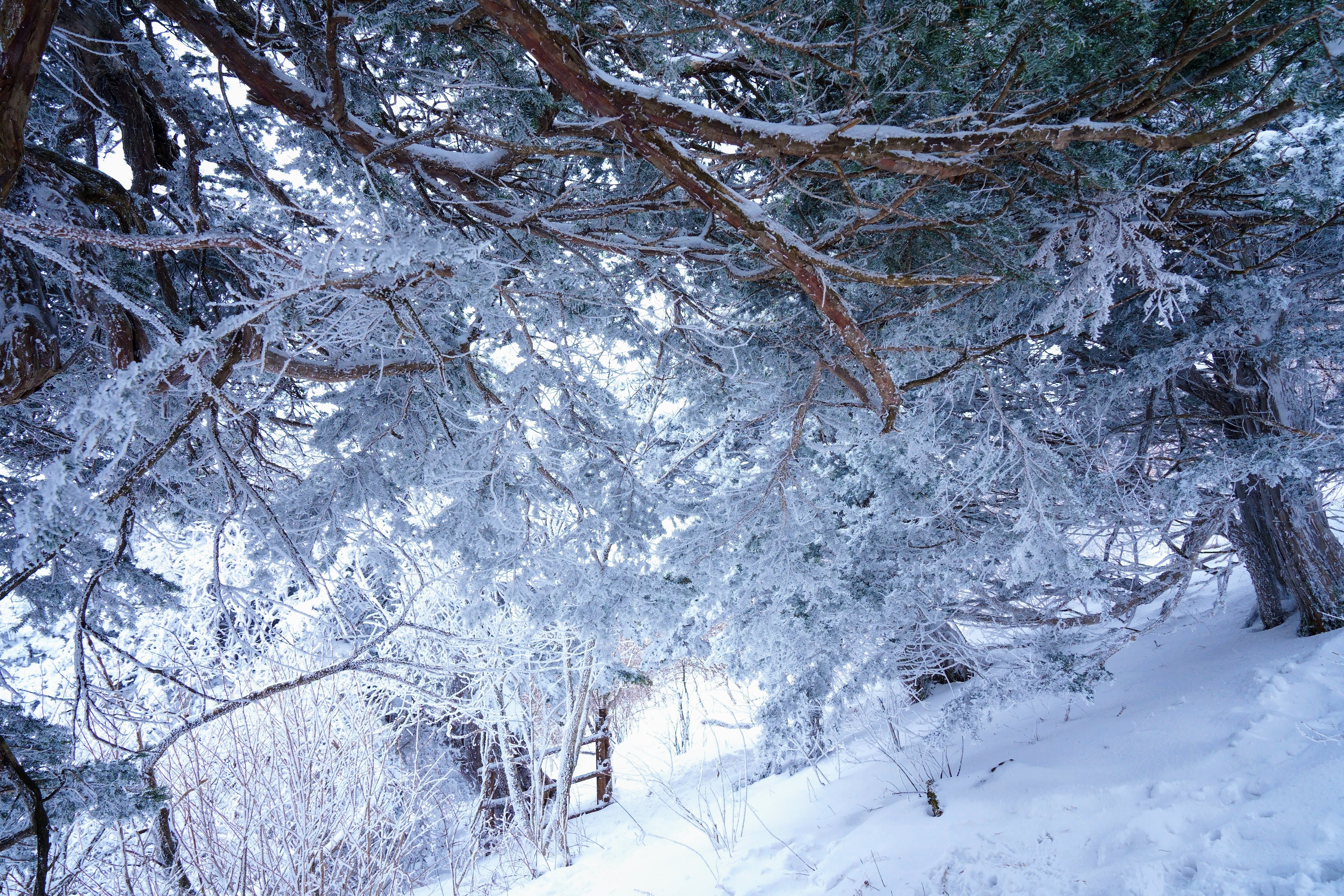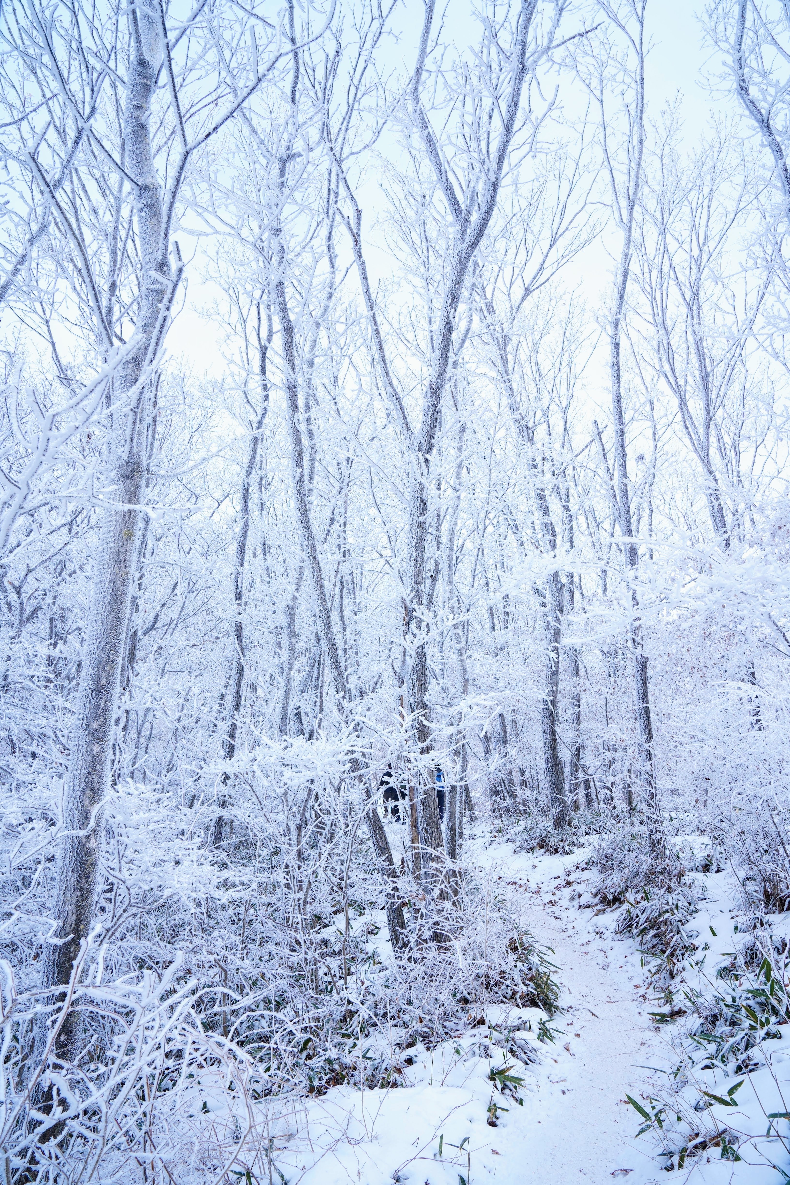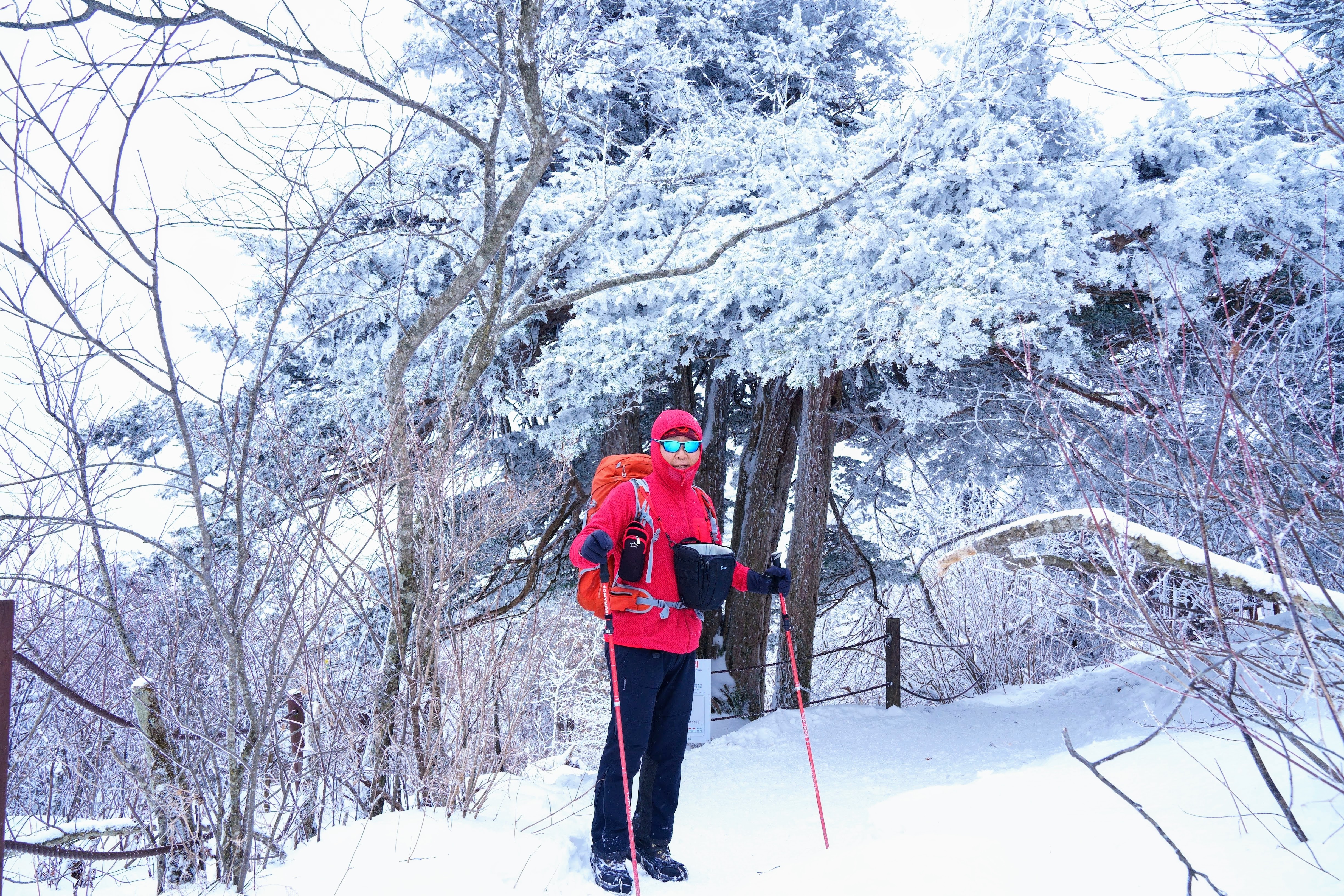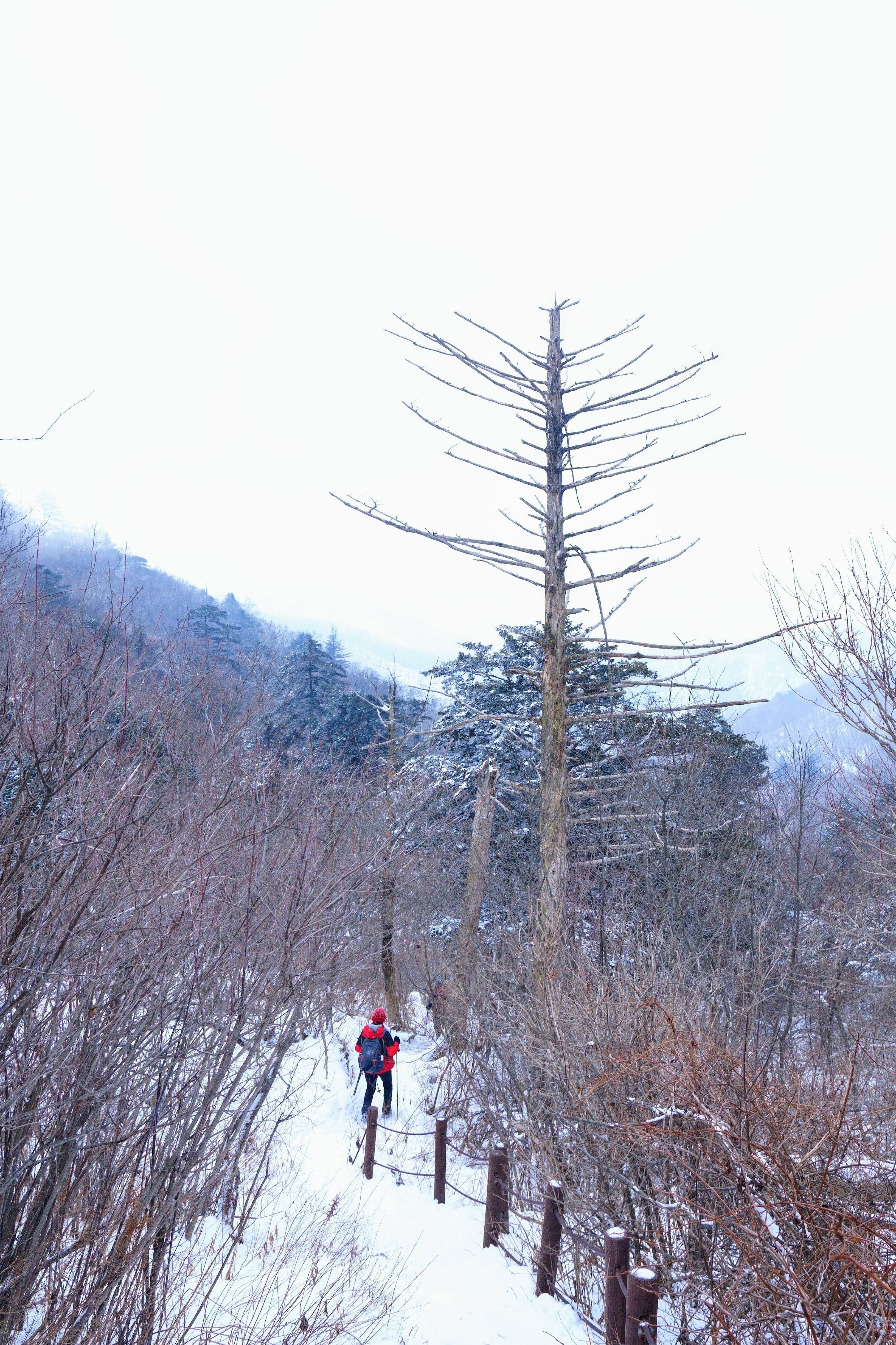 휴식을 마치고는 다시 배낭을 짊어지고 하산을 시작합니다. 능선을 따라서 진행하는데 구름에 갇혀서 시야는 보이지 않고 바람은 거세게 몰아칩니다. 중간 중간 나뭇가지에 붙은 상고대를 사진에 담으면서 진행하다 보니 삼거리가 나타나고 우회전해서 내려가니 바로 하얗게 눈을 덮은 주목들이 나타납니다. 주목에서도 사진을 담아가면서 하산길을 이어갑니다. 이후로는 산 정상에서 시간을 많이 소비했기에 빠른 걸음으로 눈길을 따라서 하산길을 이어갑니다.