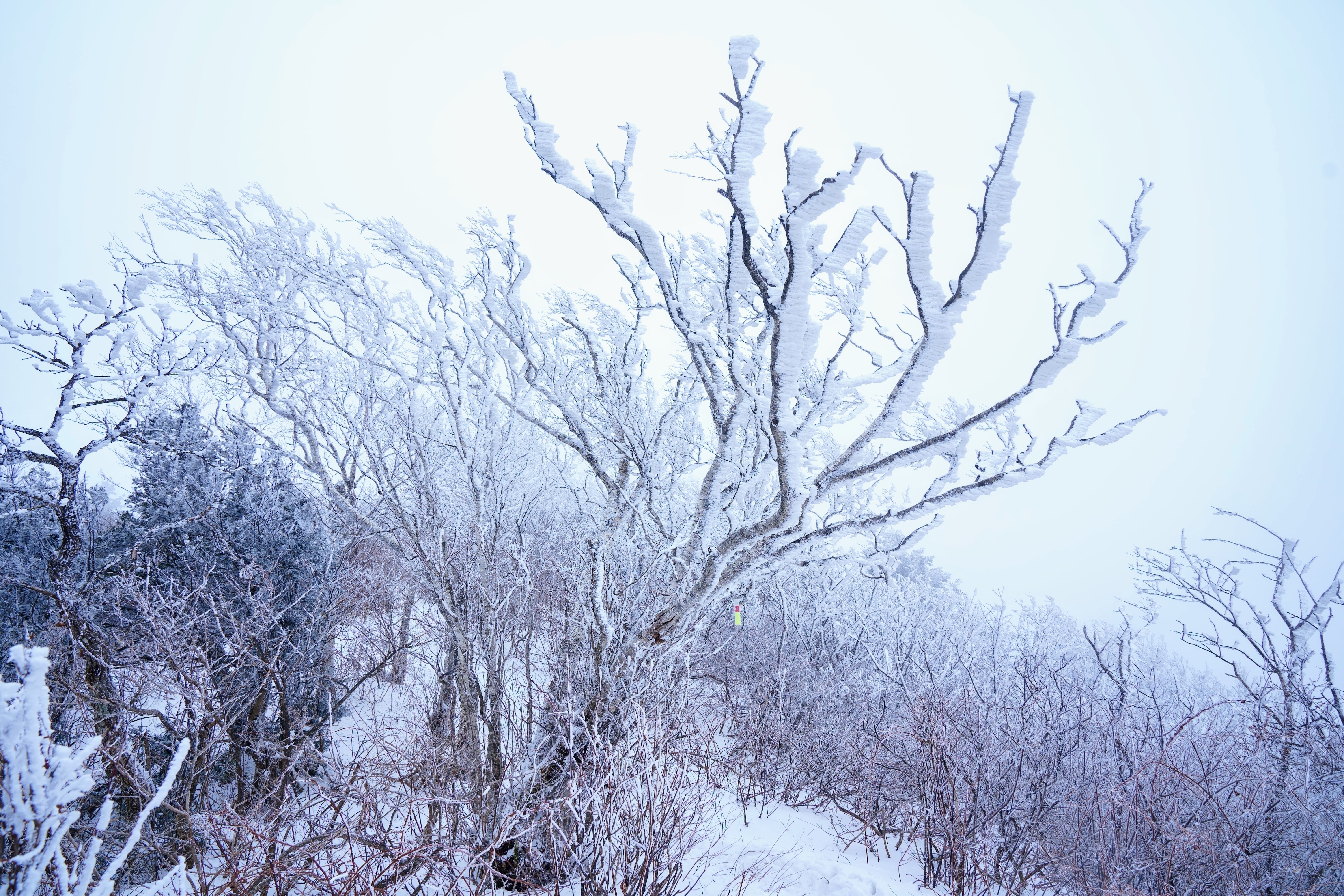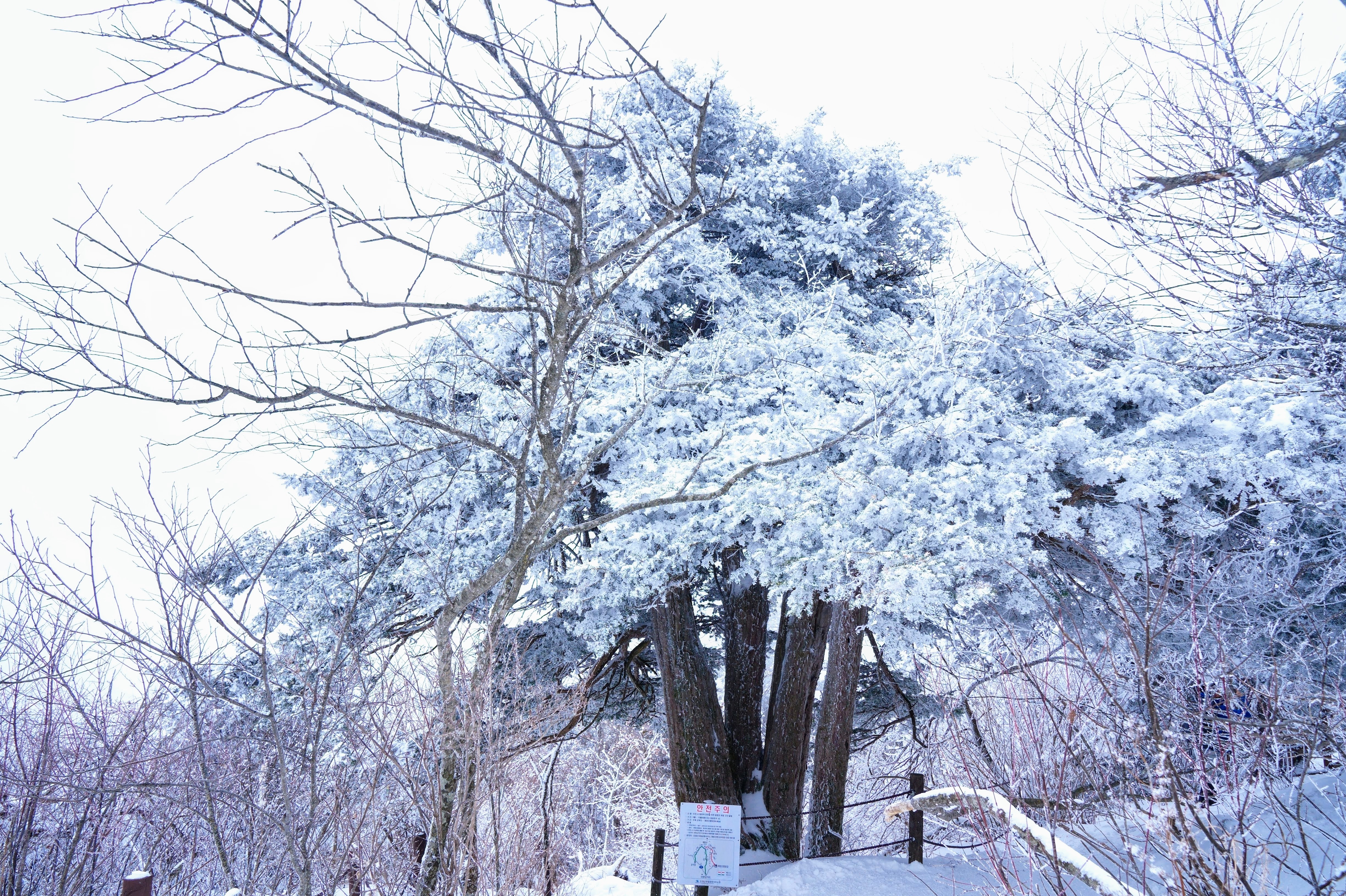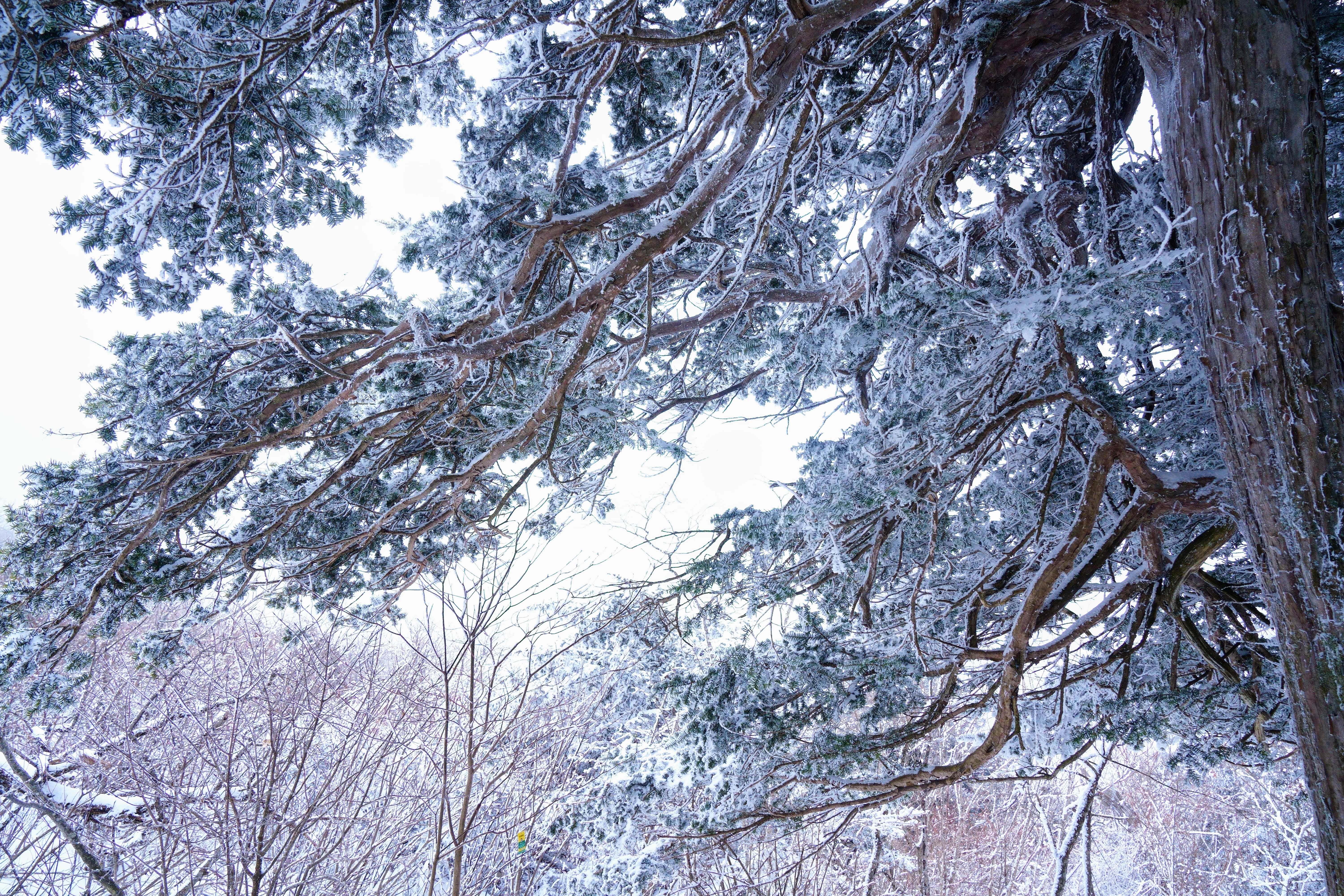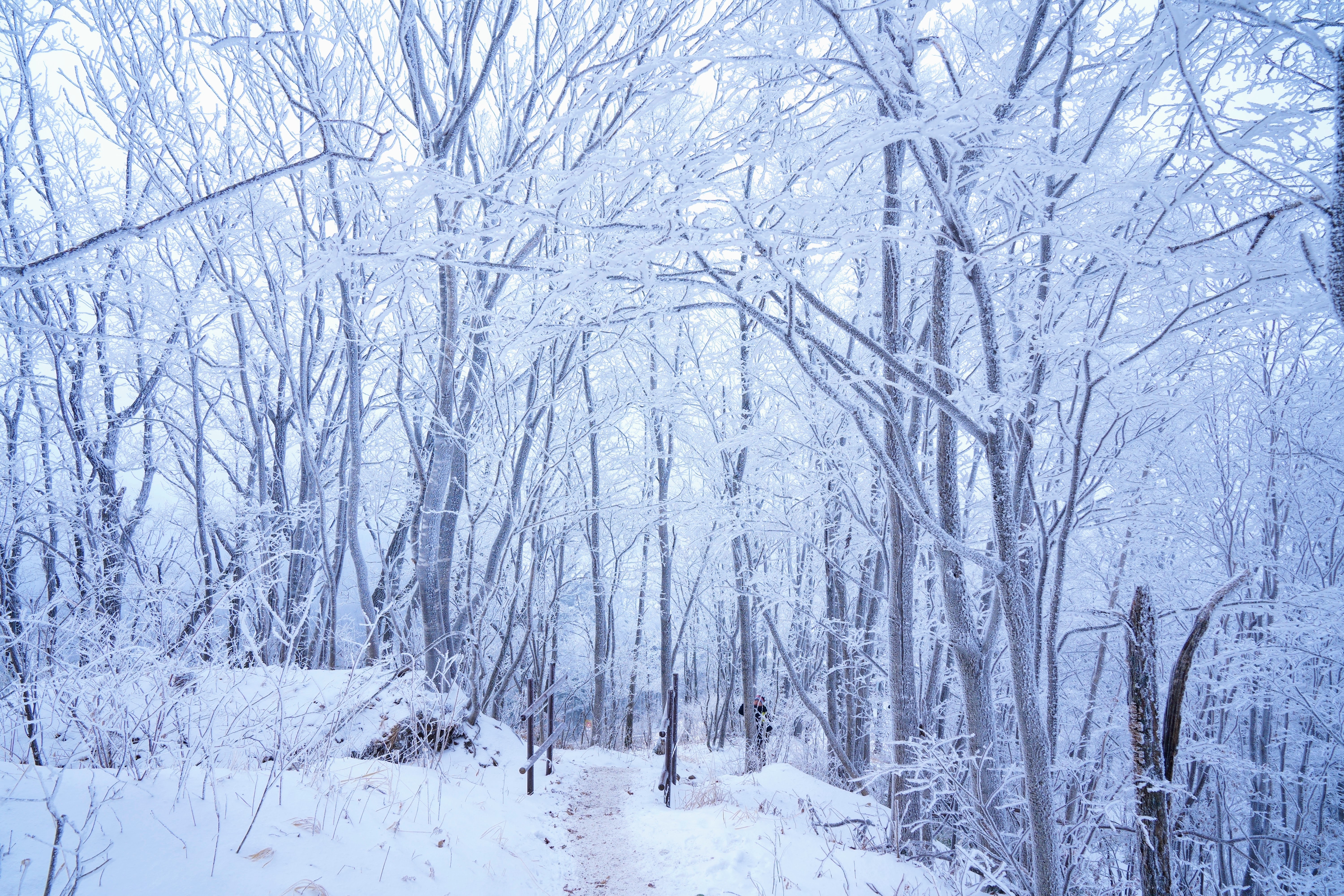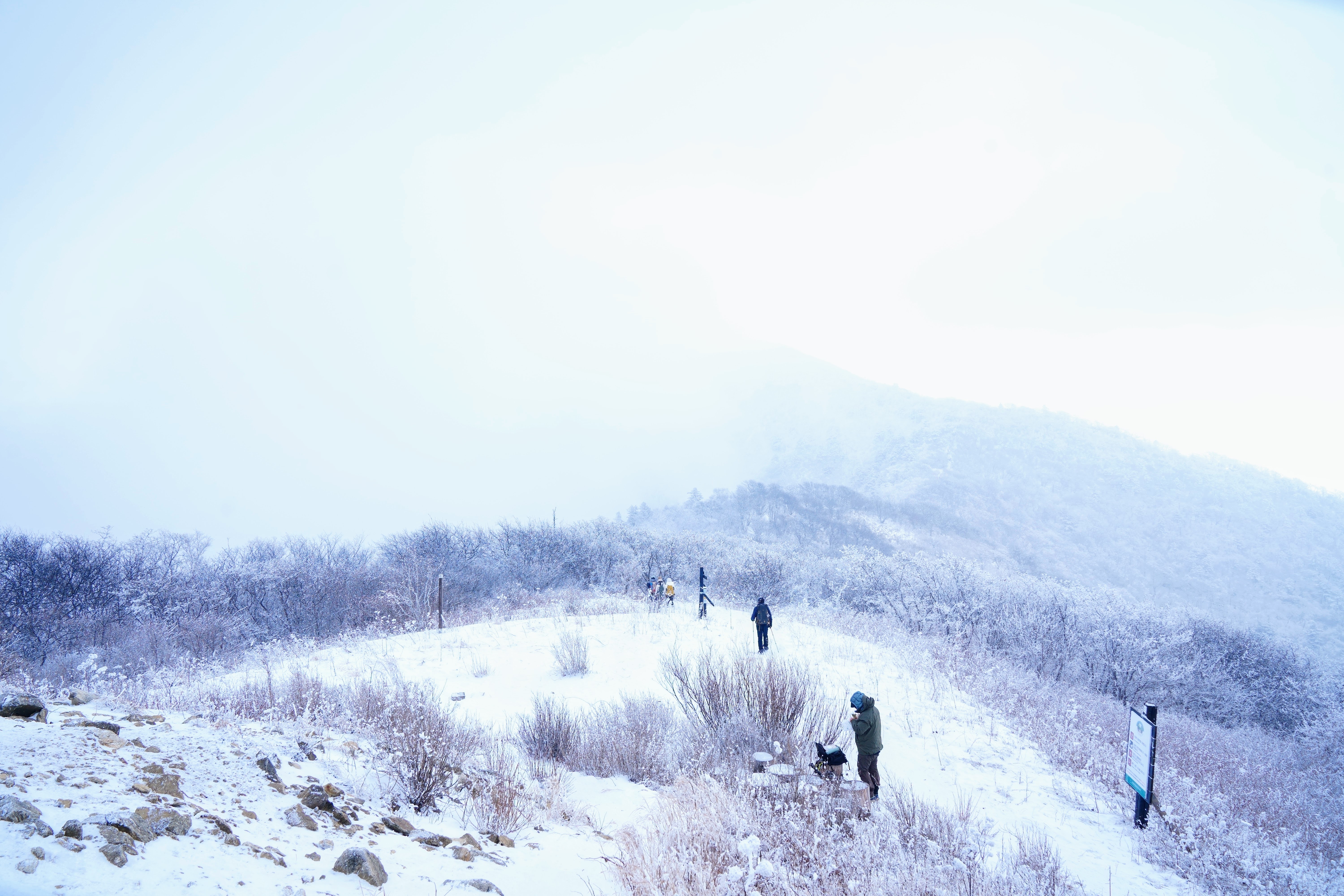 휴식을 마치고는 다시 배낭을 짊어지고 하산을 시작합니다. 능선을 따라서 진행하는데 구름에 갇혀서 시야는 보이지 않고 바람은 거세게 몰아칩니다. 중간 중간 나뭇가지에 붙은 상고대를 사진에 담으면서 진행하다 보니 삼거리가 나타나고 우회전해서 내려가니 바로 하얗게 눈을 덮은 주목들이 나타납니다. 주목에서도 사진을 담아가면서 하산길을 이어갑니다. 이후로는 산 정상에서 시간을 많이 소비했기에 빠른 걸음으로 눈길을 따라서 하산길을 이어갑니다.