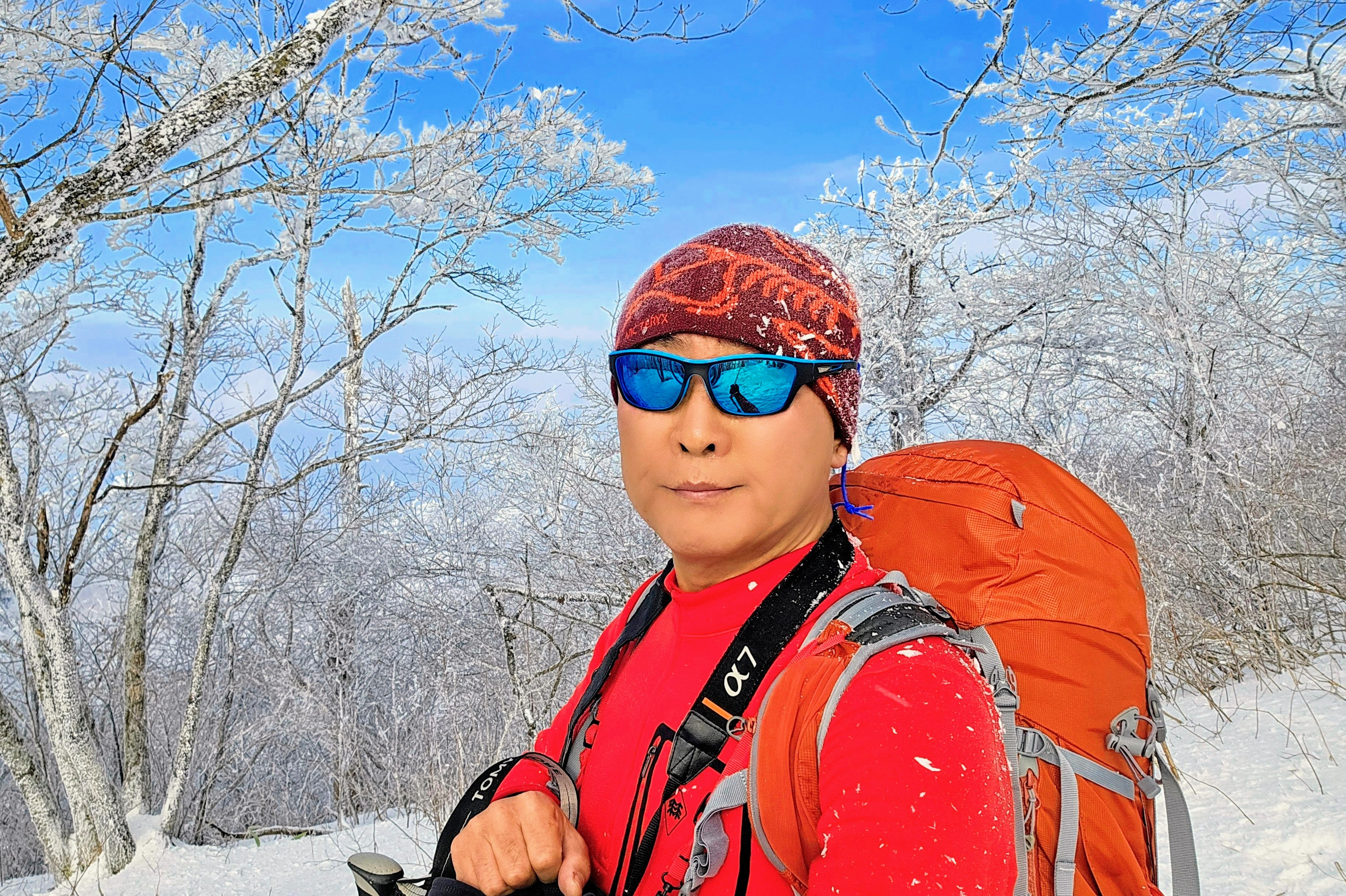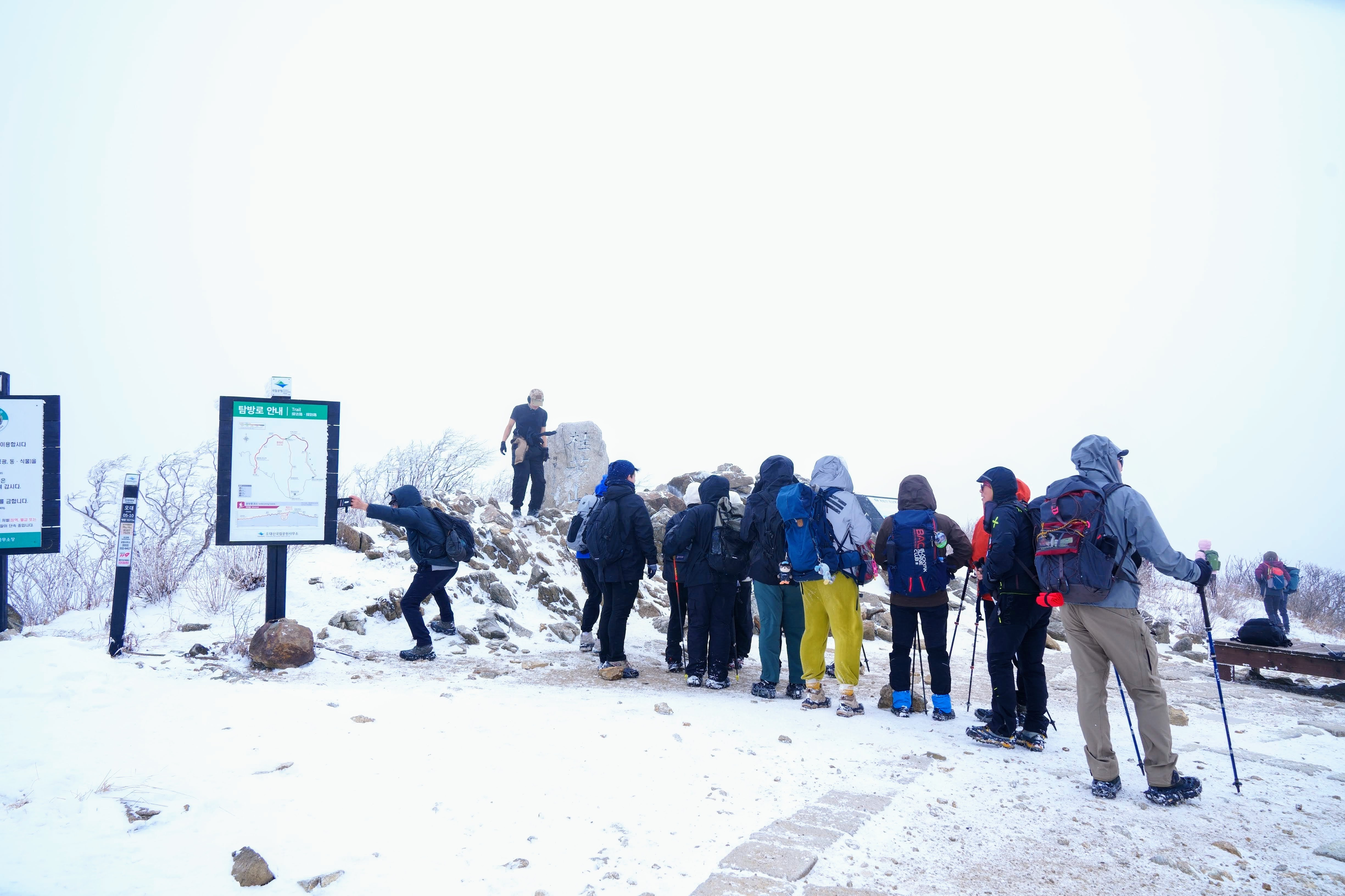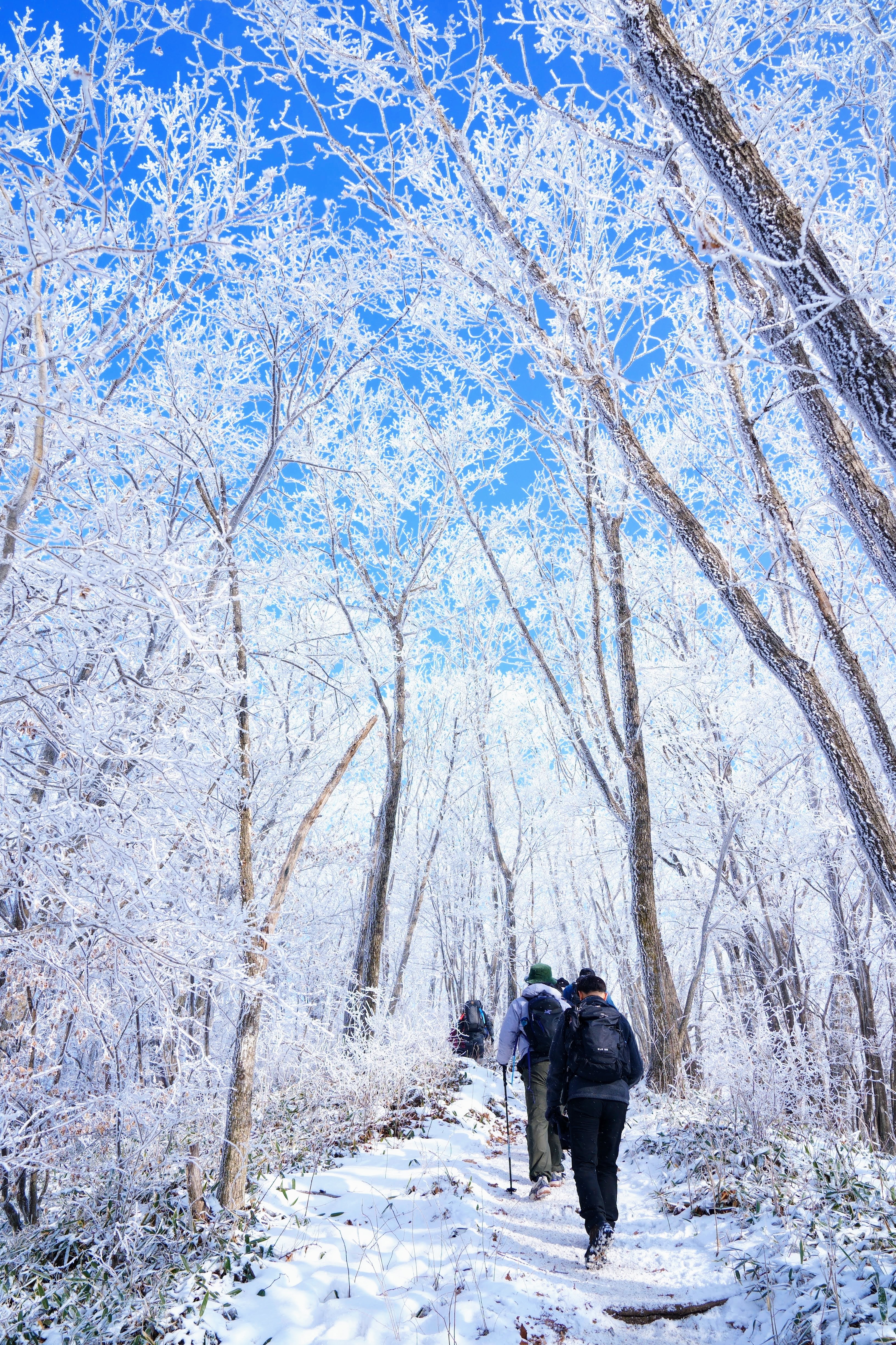 운두령에서 버스는 정차하고 버스에서 내리니, 운두령 휴게소 주변에도 상고대가 하얗게 피었습니다. 휴게소 데트에서 산행 준비를 하는데, 고지대인데다가 바람이 불어오니 추위가 파고 듭니다. 아이젠까지 착용하고 계단을 따라서 능선길에 올라서 가늘지만 하얗게 상고대가 붙은 나무숲길을 따라서 걸어갑니다. 파란 하늘 배경에 하얀 산호초같은 나뭇가지의 앙상블.. 겨울 산행의 최고의 행복이 아닐까요.